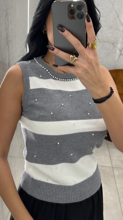Μπλούζα αμάνικη πλεκτή με πέρλες/Γκρι
