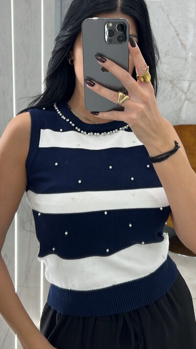 Μπλούζα αμάνικη πλεκτή με πέρλες/Μπλε