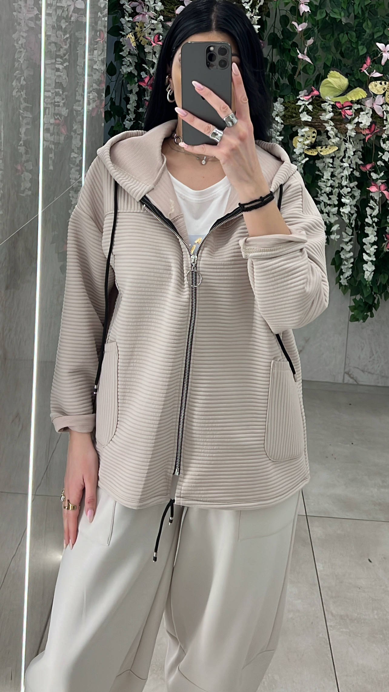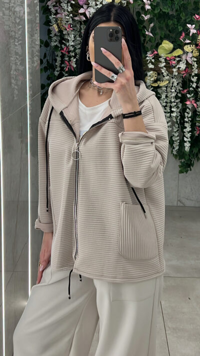 Ζακέτα με κουκούλα ,τσέπες και κορδόνι στο τελειωμα .