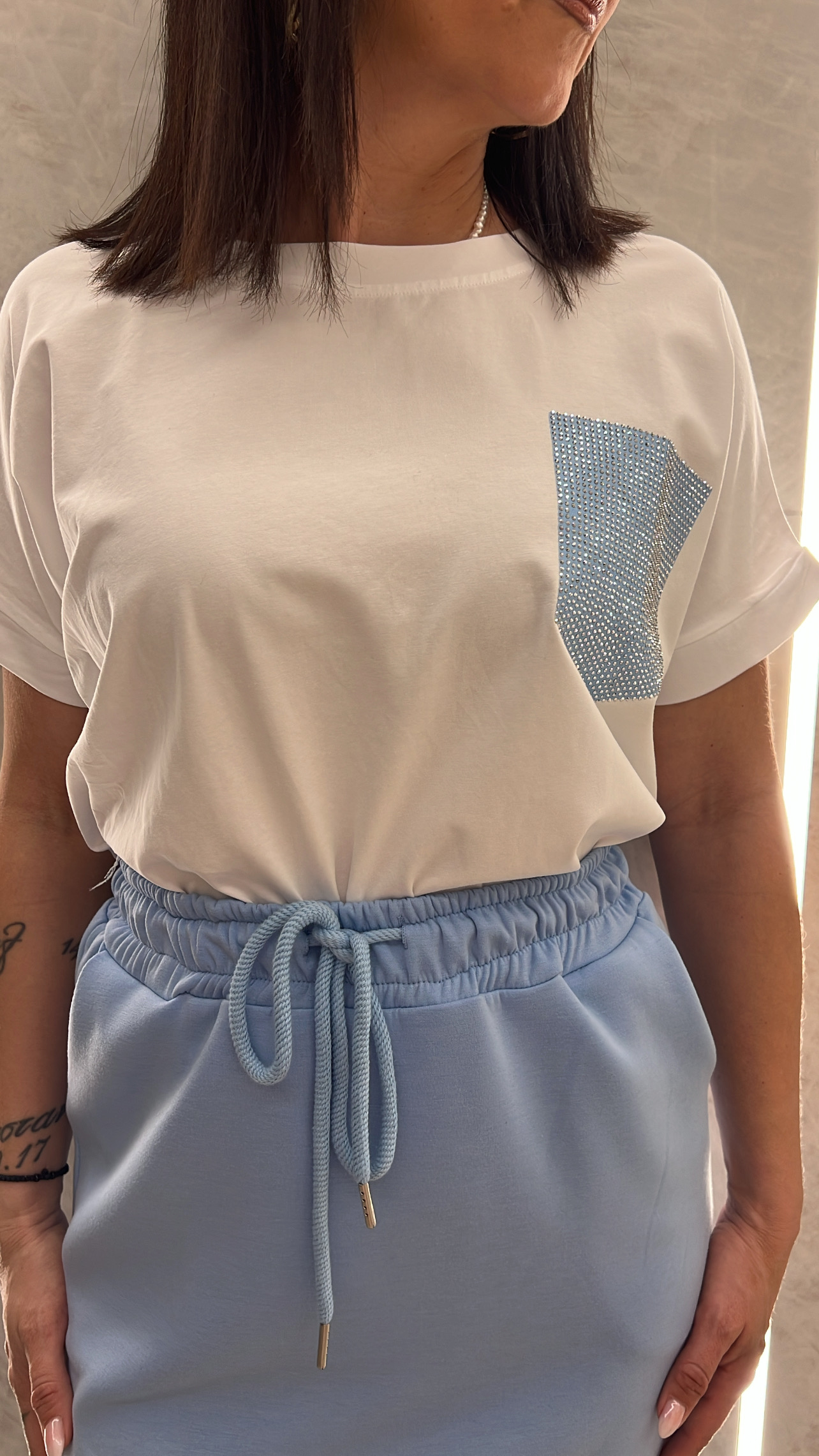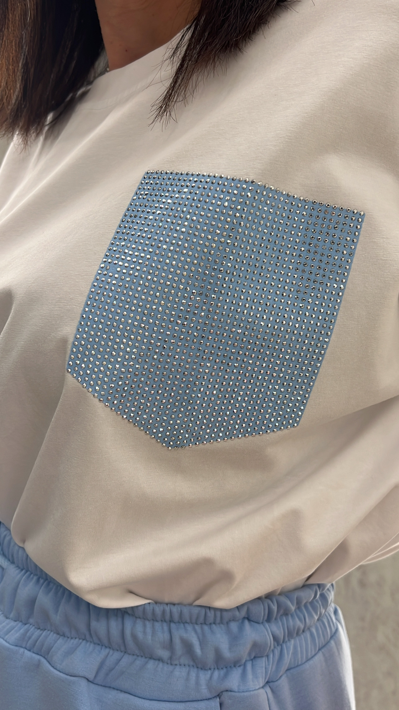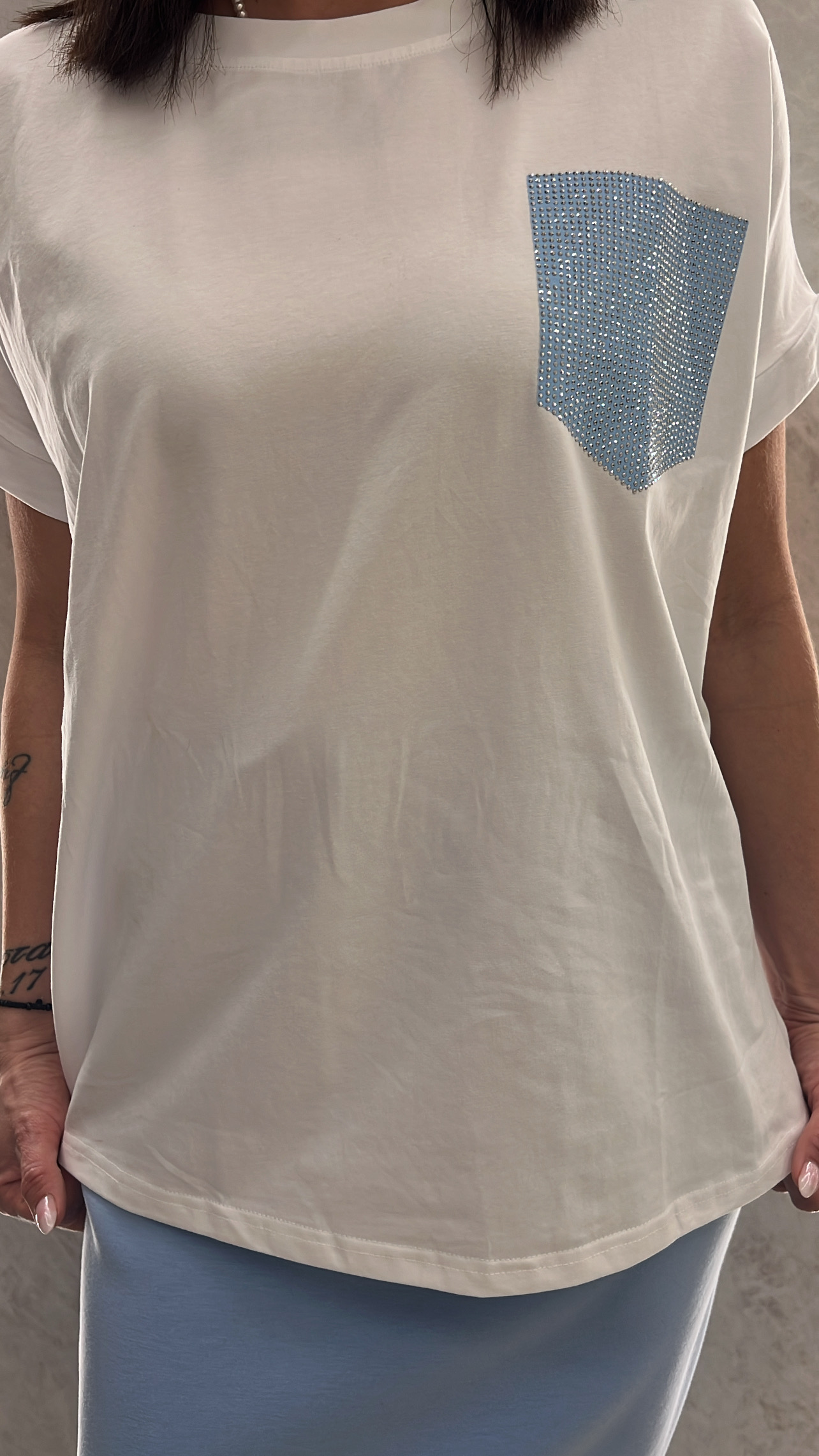 Μπλούζα κοντομάνικι λευκη με τσέπι με στρας .