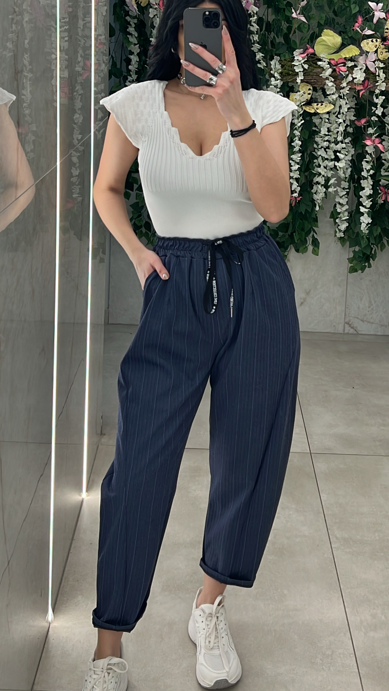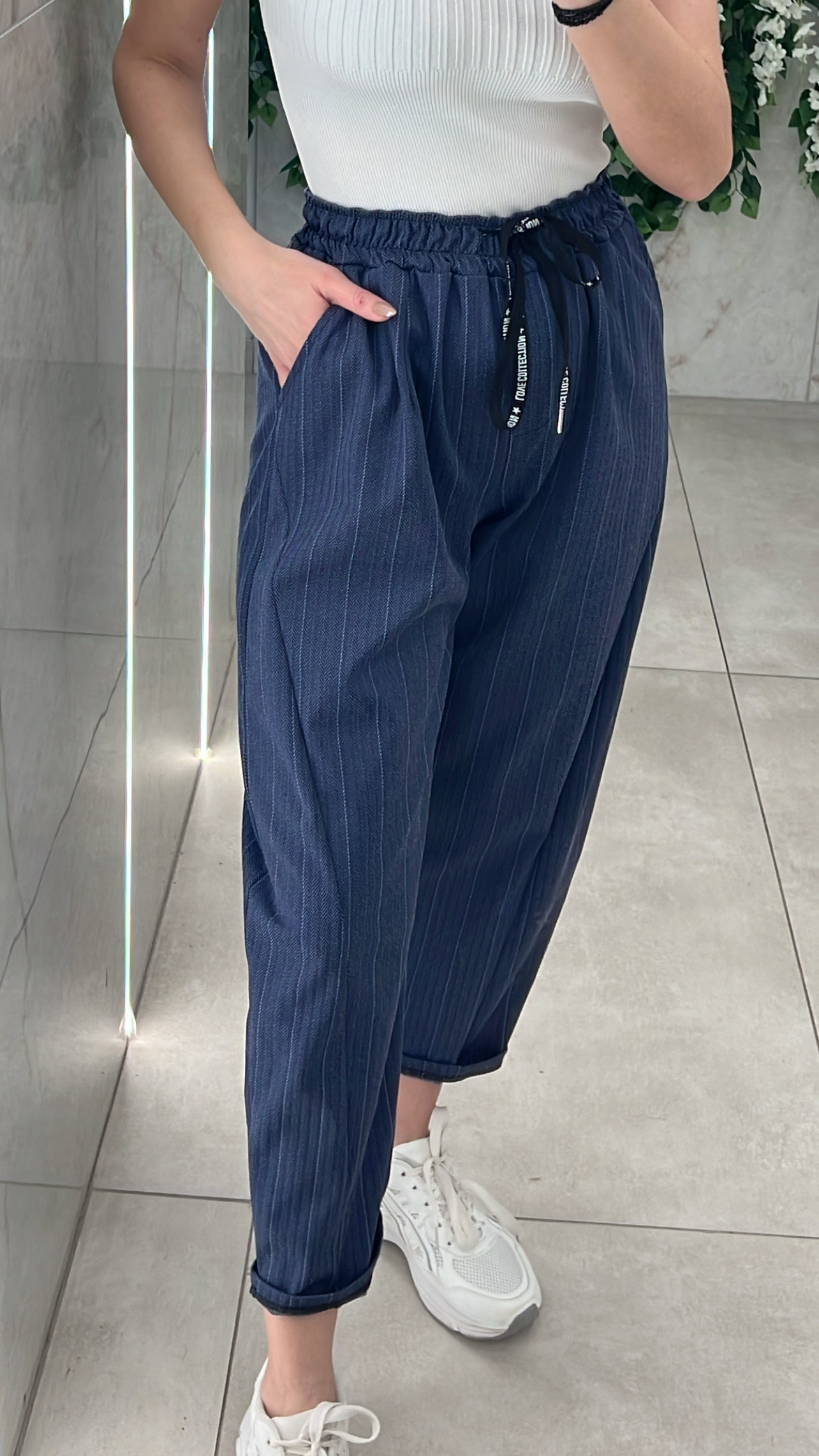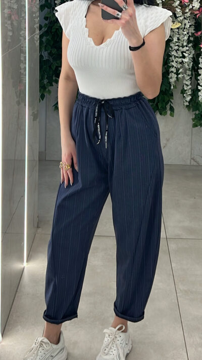 Παντελόνι ελαστικό με ρίγες ,λάστιχο ,κορδόνι και τσέπες στην μέση .
