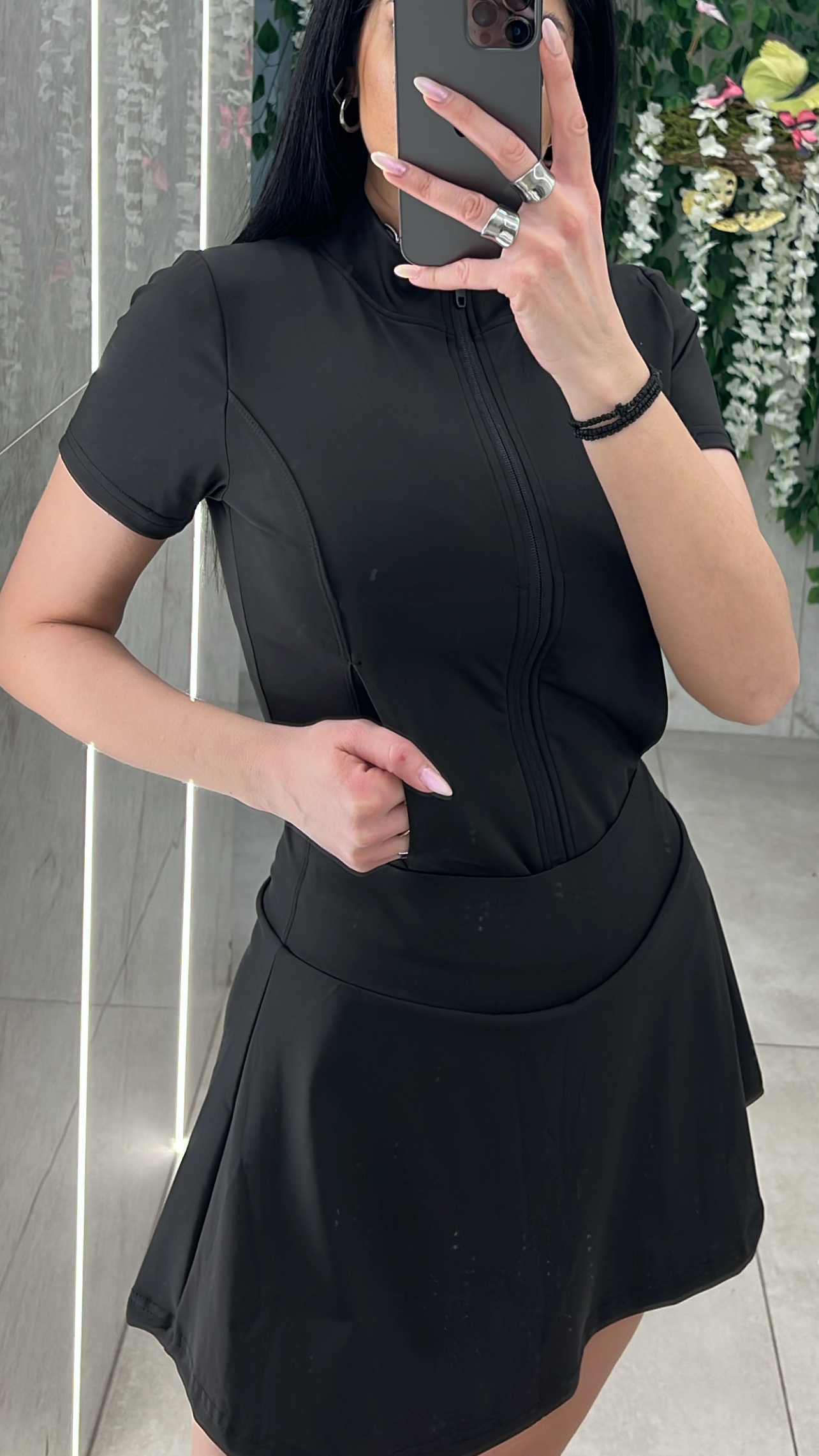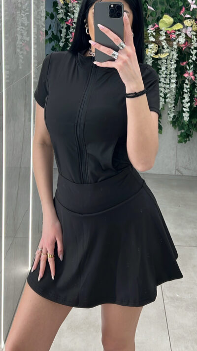 Σετ ζακέτα κοντομάνικι ,κλεινει με φερμουαρ και εχει τσέπες  και φούστα με λάστιχο στην μεση  και ενσωματωμενο κολαν απο μεσα .