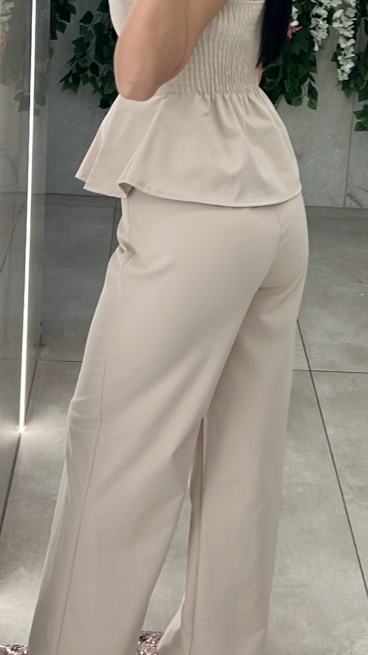 Σέτ παντελόνα διαθετει λάστιχο στην μέση και  κλεινει με κουμπι και φερμουαρ και τοπ στράπλες με λάστιχο στην πλάτη που ανοιγει στο τελειωμα .