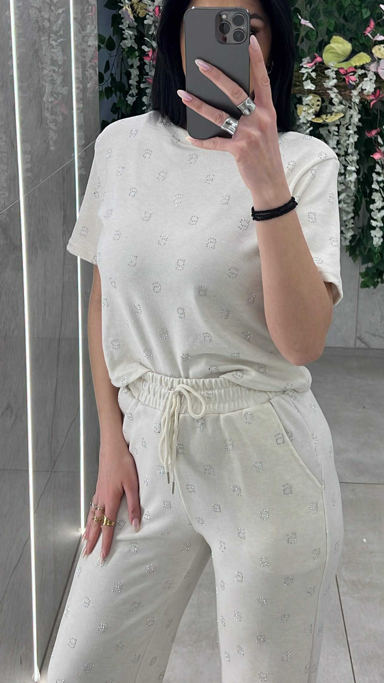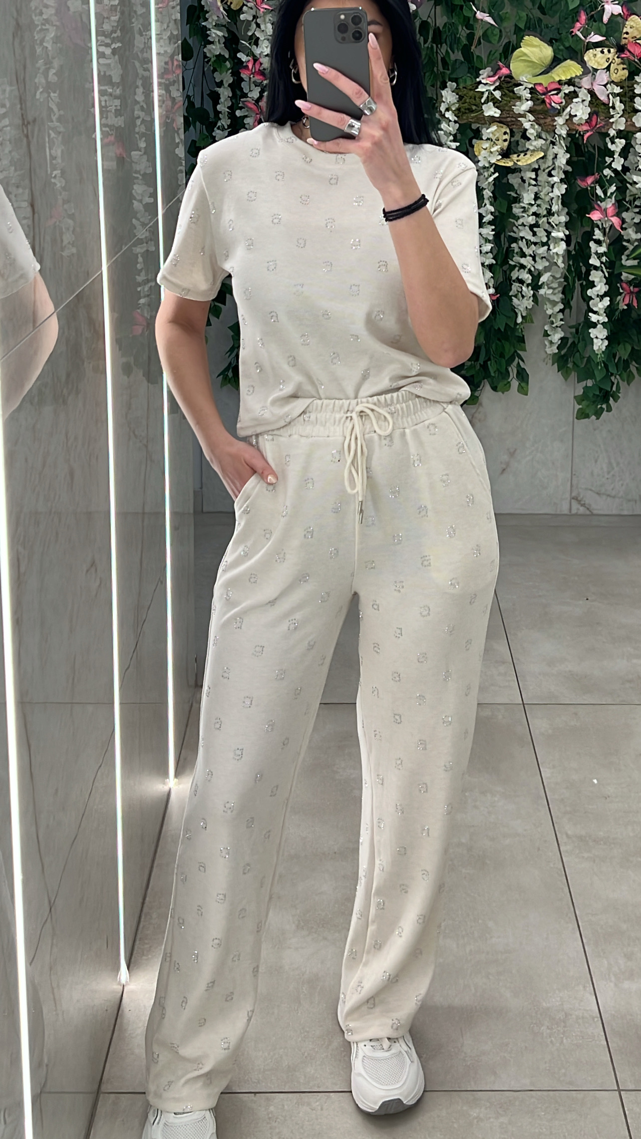 Σετ πλεκτό με στρας , μπλουζα κοντομάνικι και παντελονα με τσέπες ,λαστιχο και κορδονι στην  μεση .
