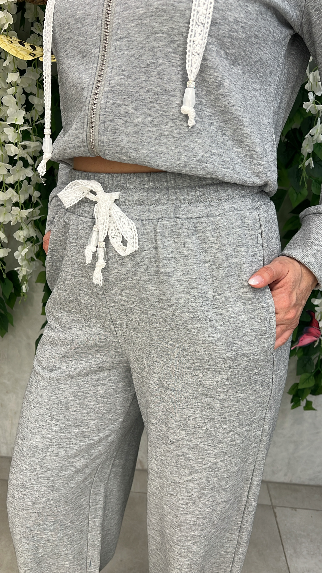 Σετ φόρμας , ζακέτα με κορδονια και κουκουλα απο δαντελα και παντελόνι με λάστιχο ,τσέπες και κορδονι δαντελα .