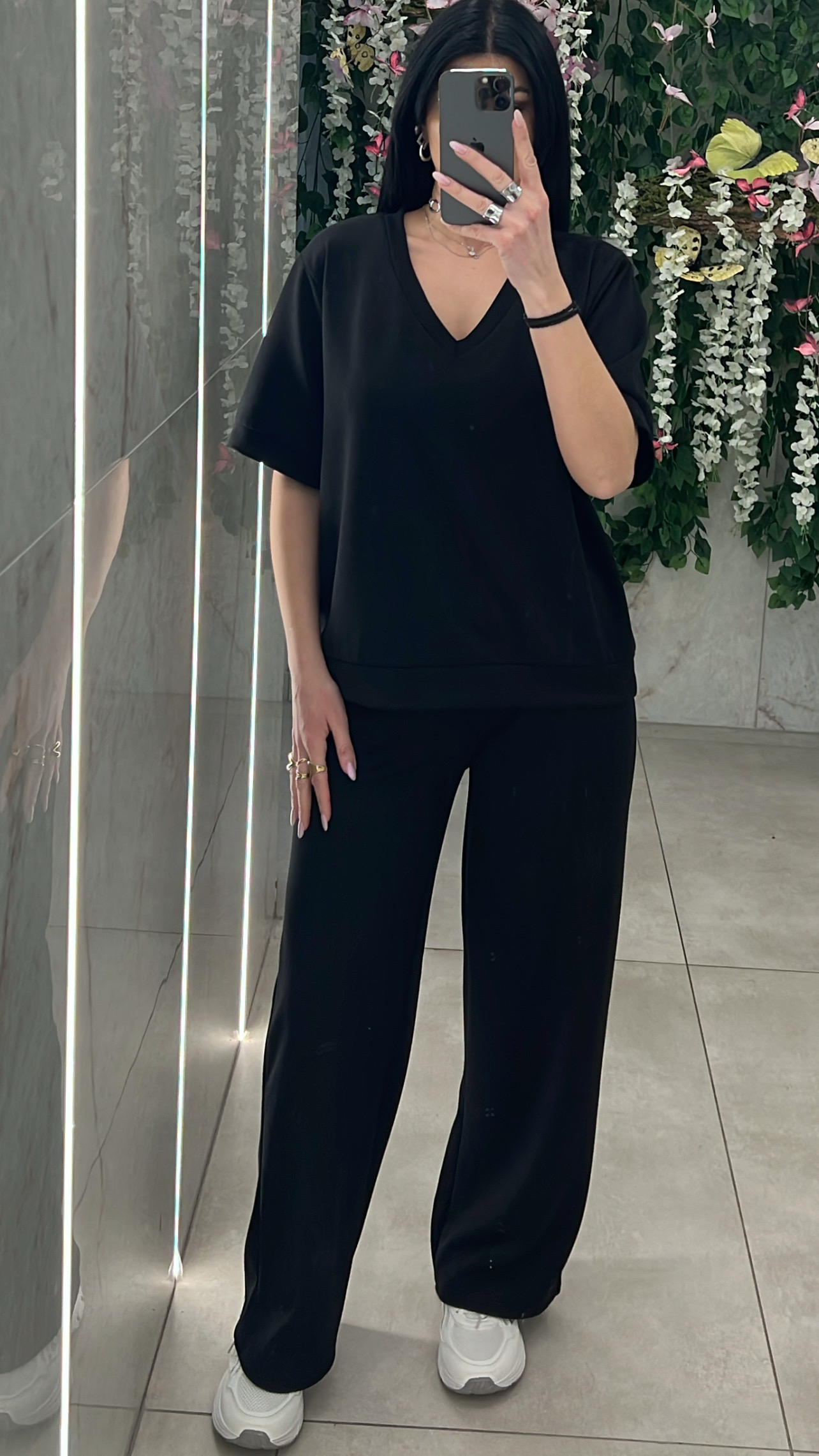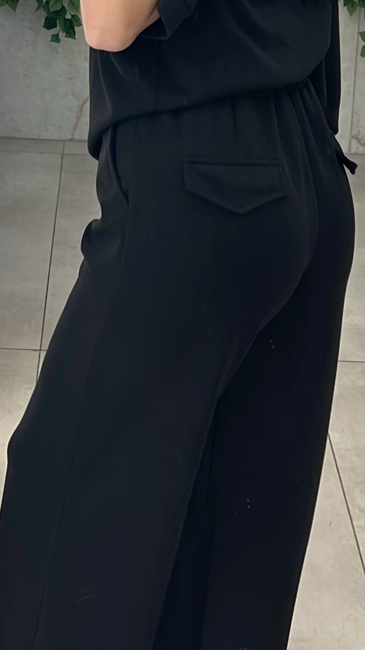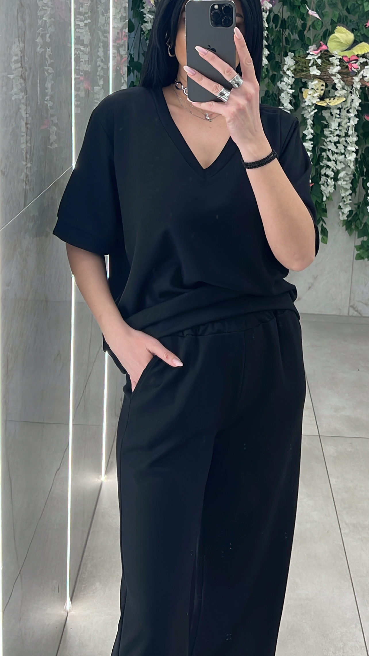 Σετ φόρμας , κοντομάνικι μπλούζα και παντελονα με λάστιχο και τσέπες στην μεση και διακοσμητικες τσέπες πισω .