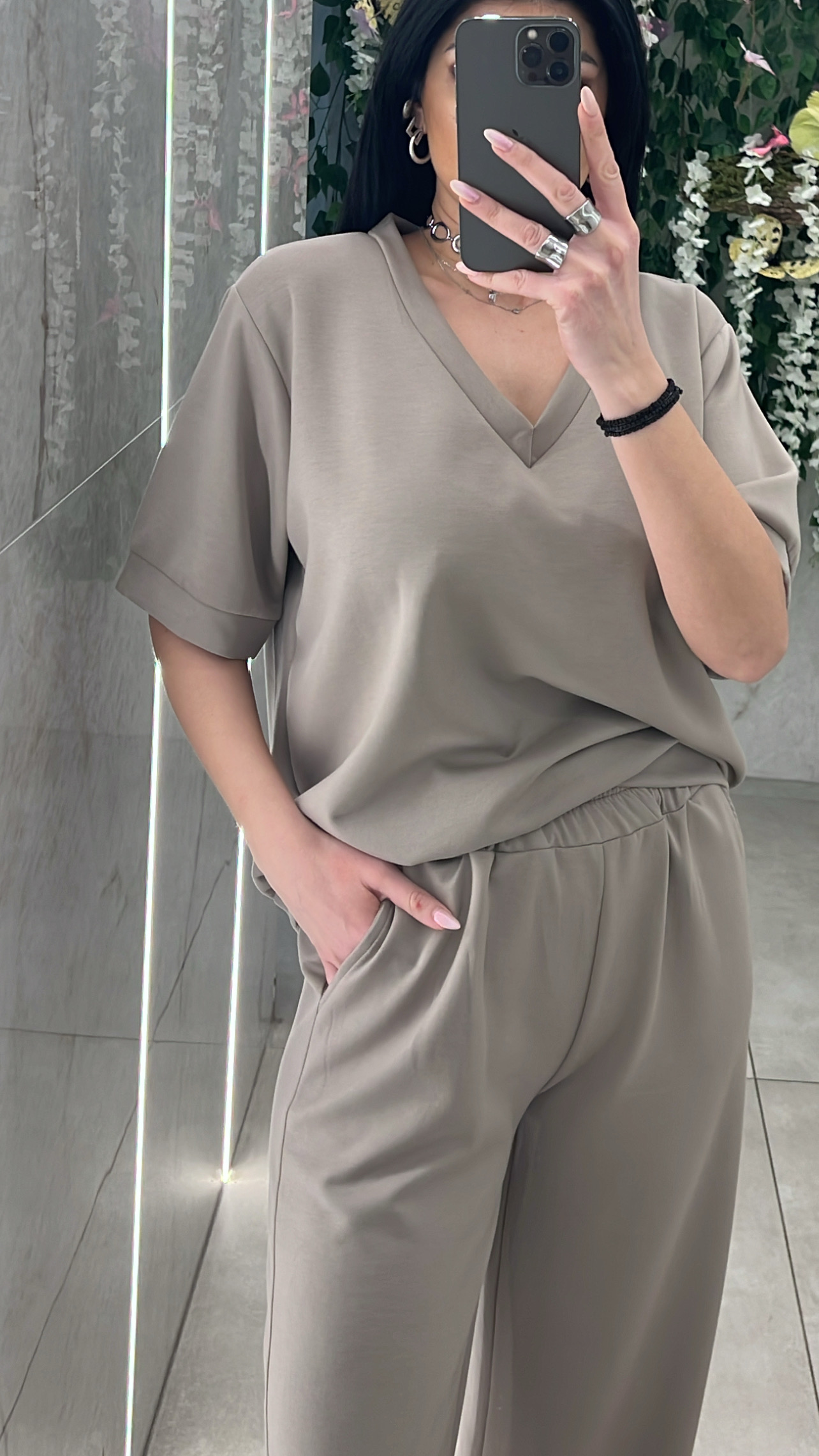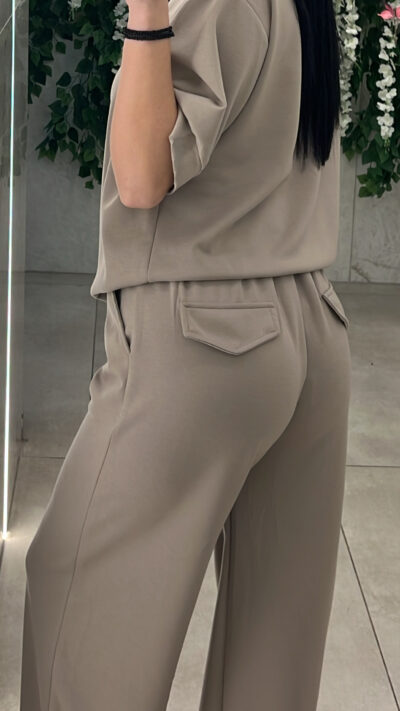 Σετ φόρμας , κοντομάνικι μπλούζα και παντελονα με λάστιχο και τσέπες στην μεση και διακοσμητικες τσέπες πισω .