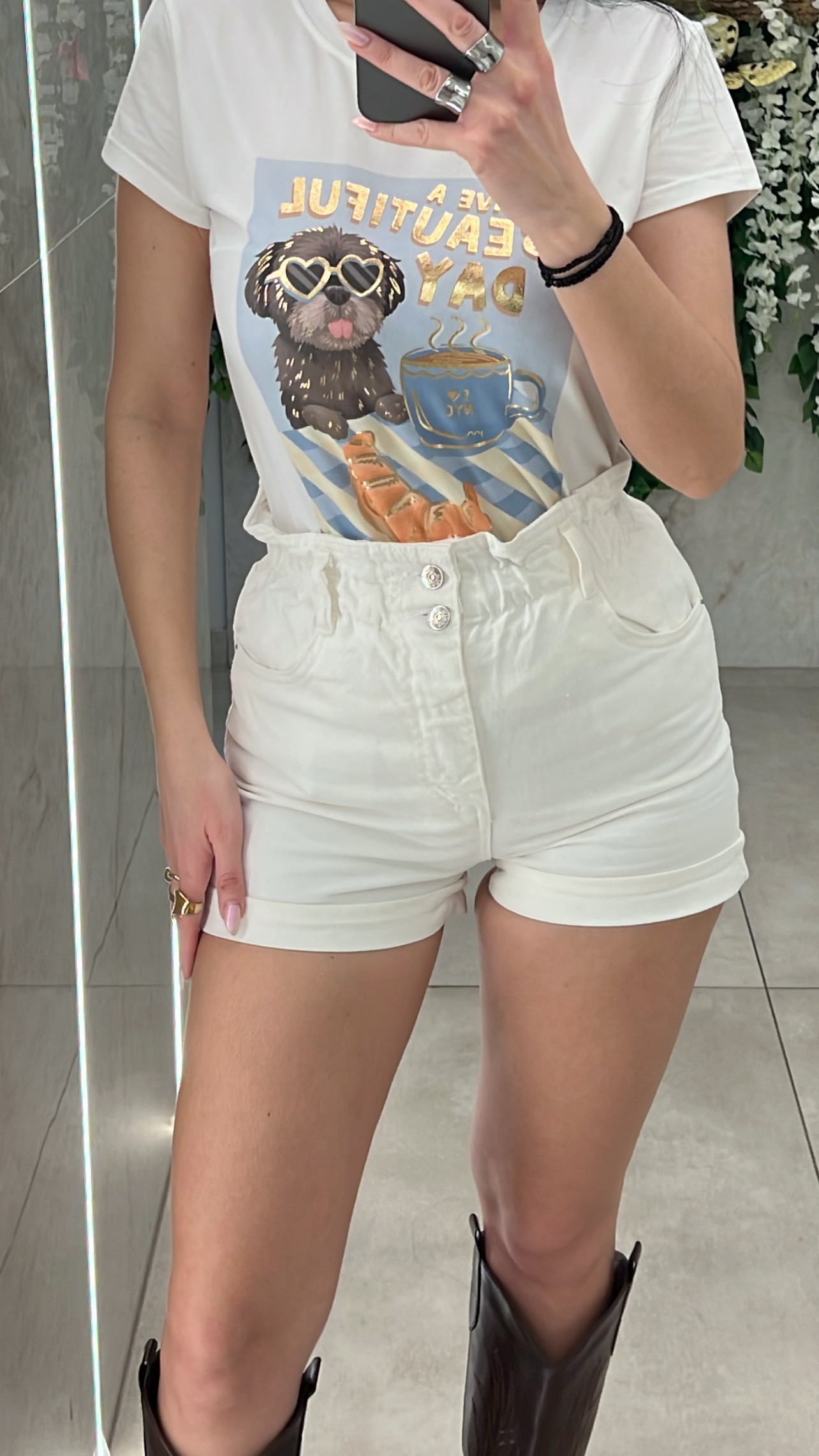 Τζιν σορτς με ρεβερ ,διαθέτει λάστιχο στην μέση ,τσέπες και κλεινει με κουμπιά.