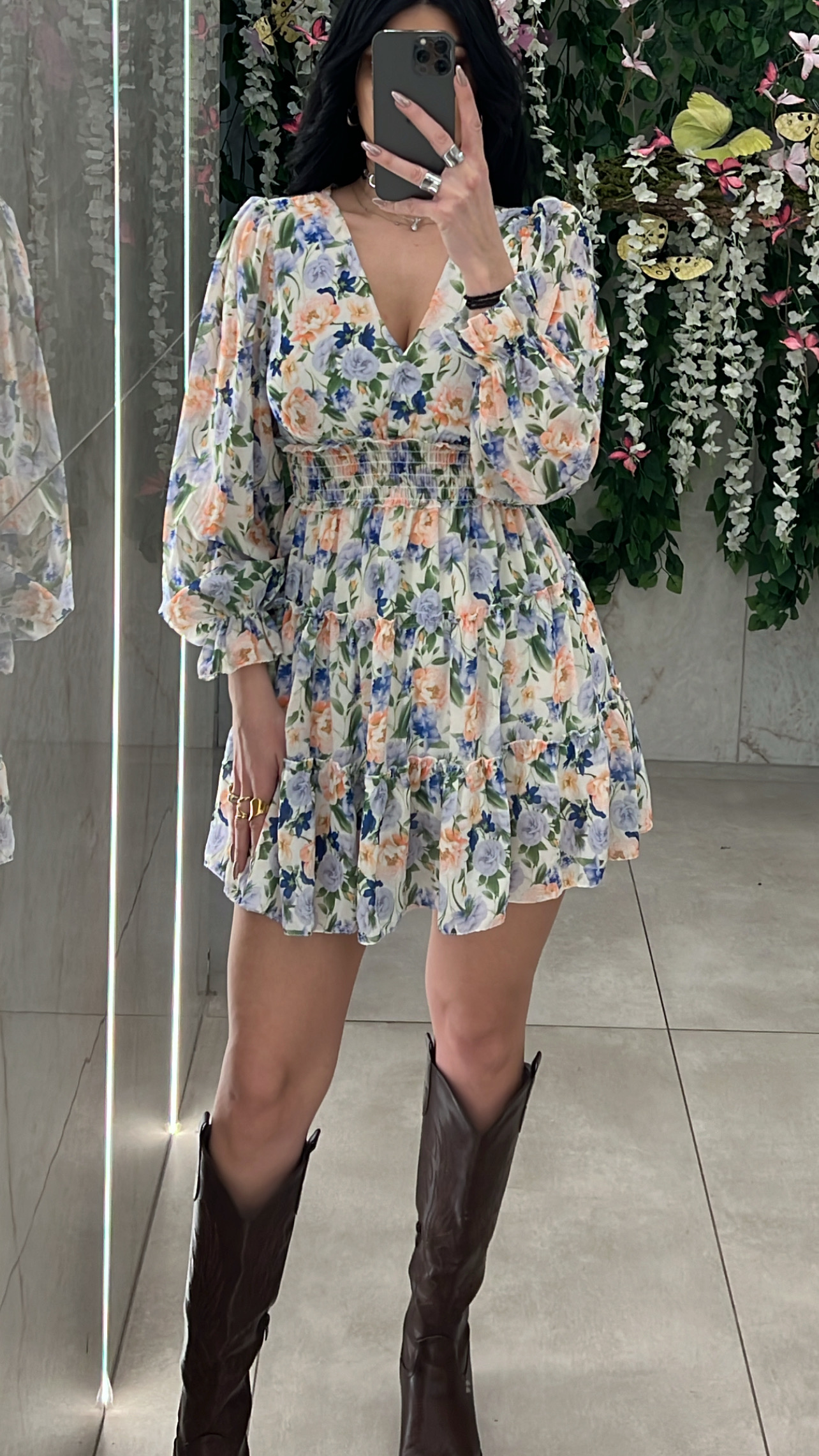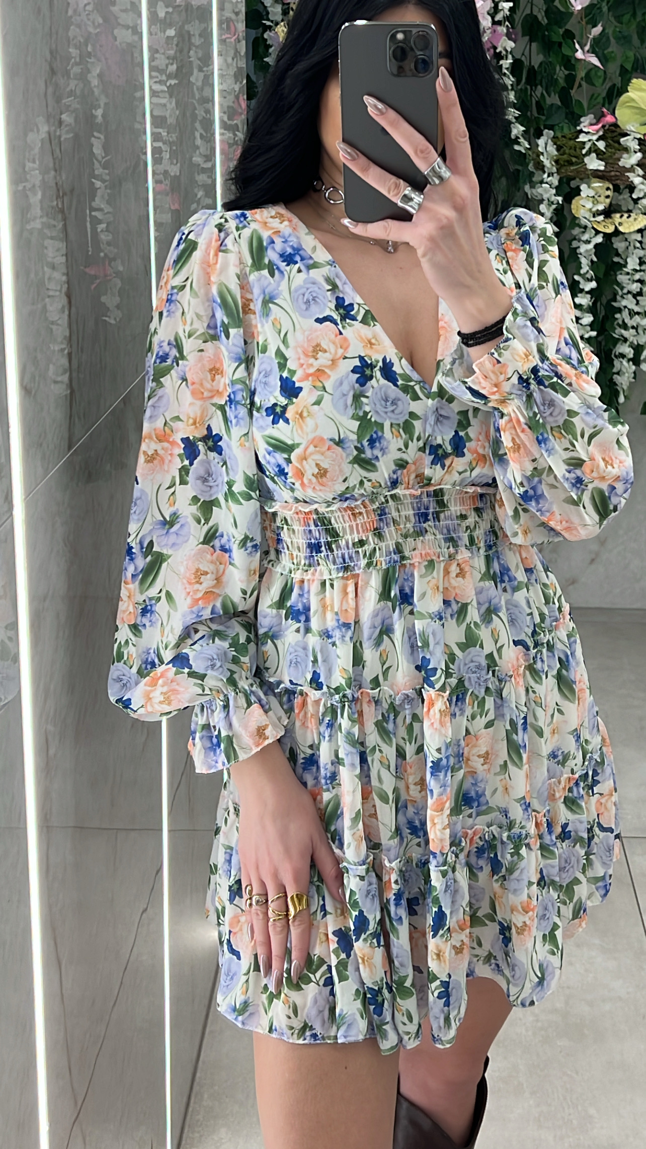 Φόρεμα φλοραλ με λάστιχο στην μέση ,βολάν στο τελειωμα ,κανει κρουάζε στο στήθος και ειναι εσωτερικα φοδραρισμενο .