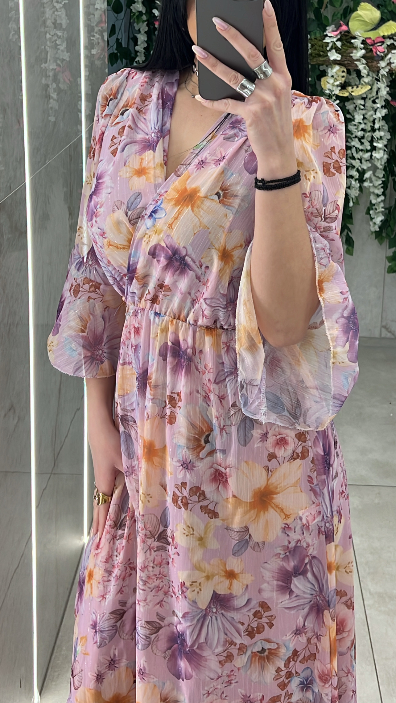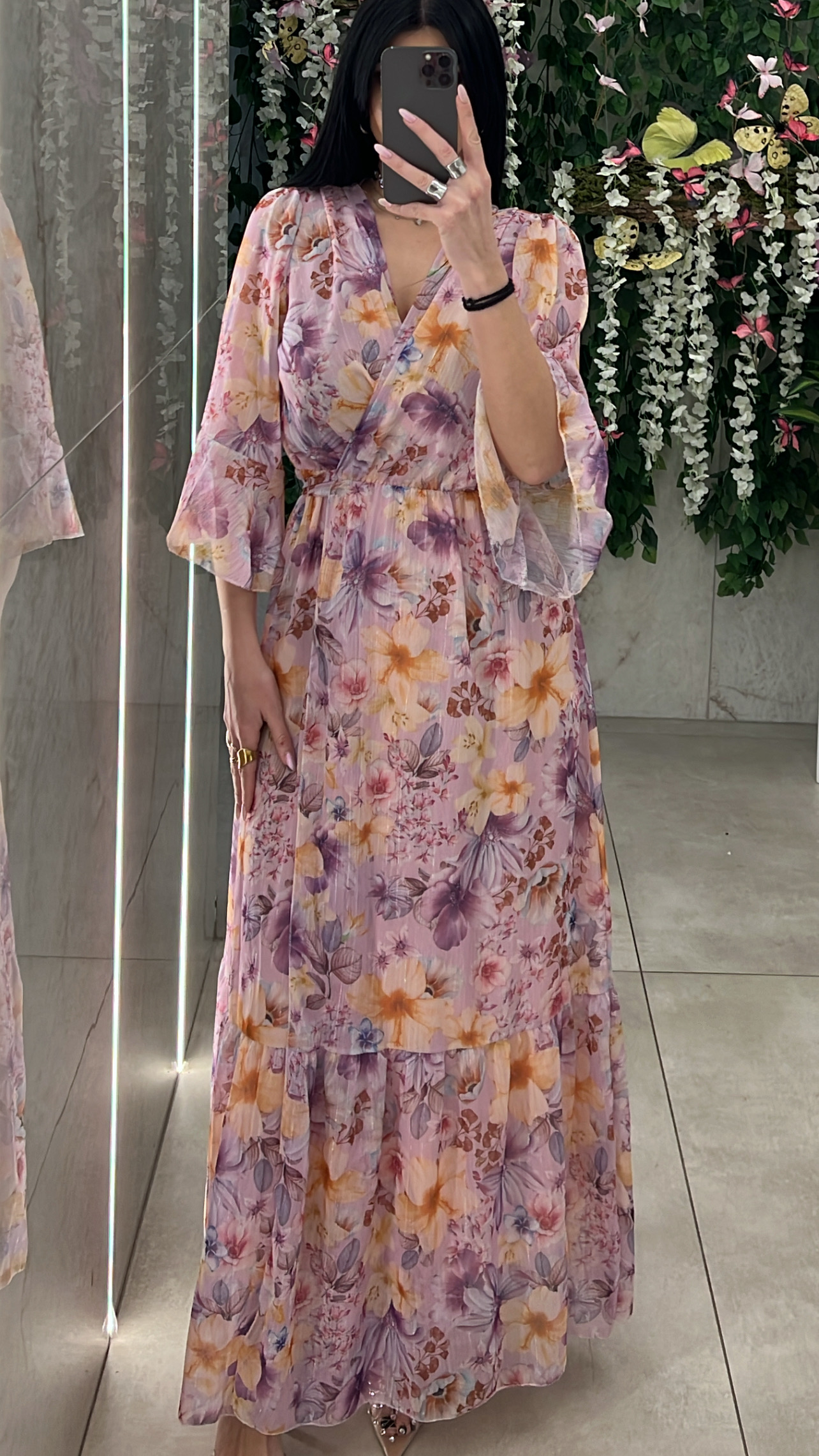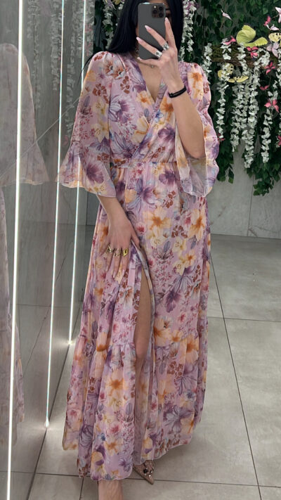 Φόρεμα μακρυ φλοραλ , δένει σαν παρεο , εχει σκισιμο και κανει ανοιγμα στο τελειωμα των μανικιων και ειναι φοδραρισμενο .