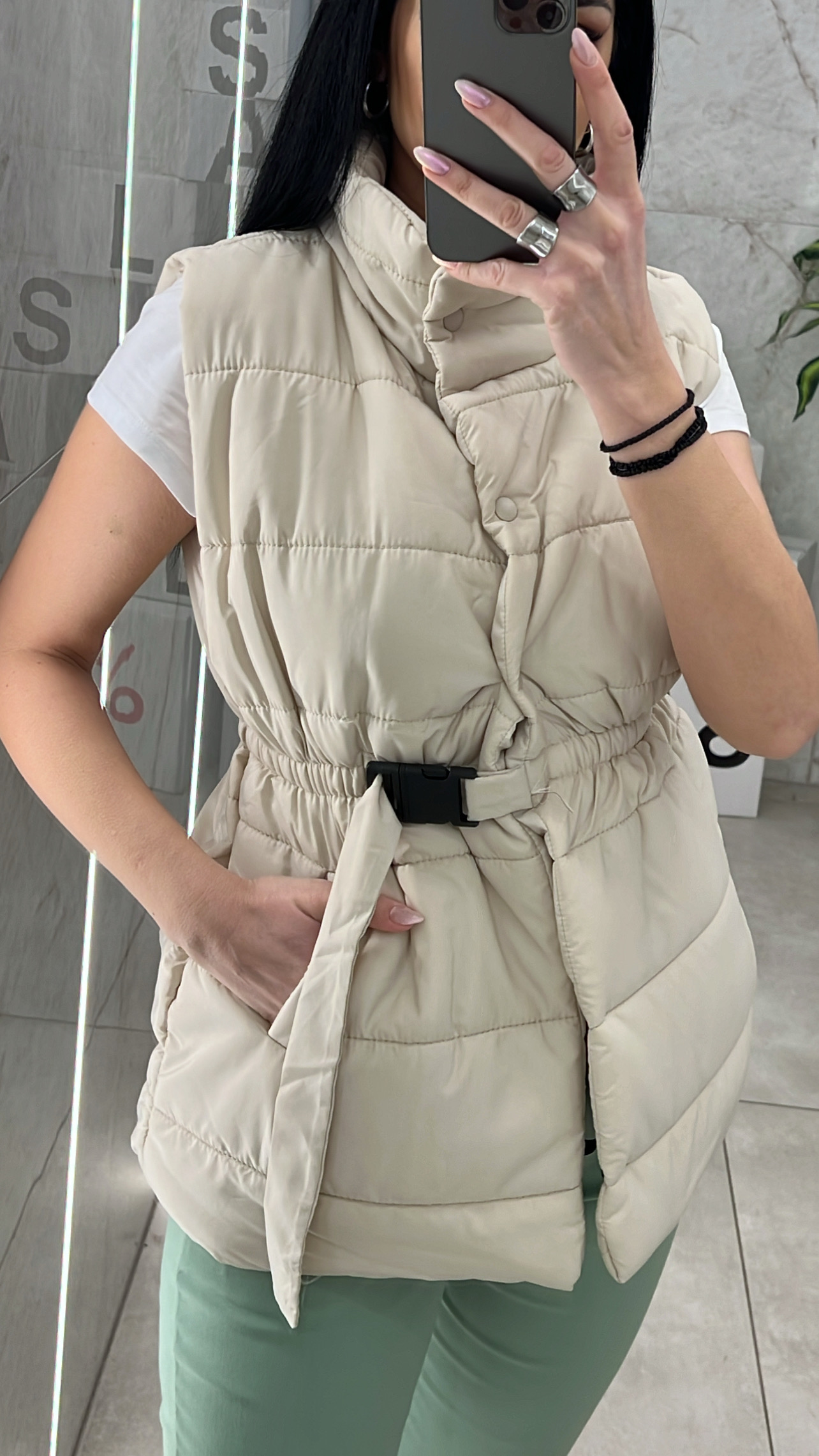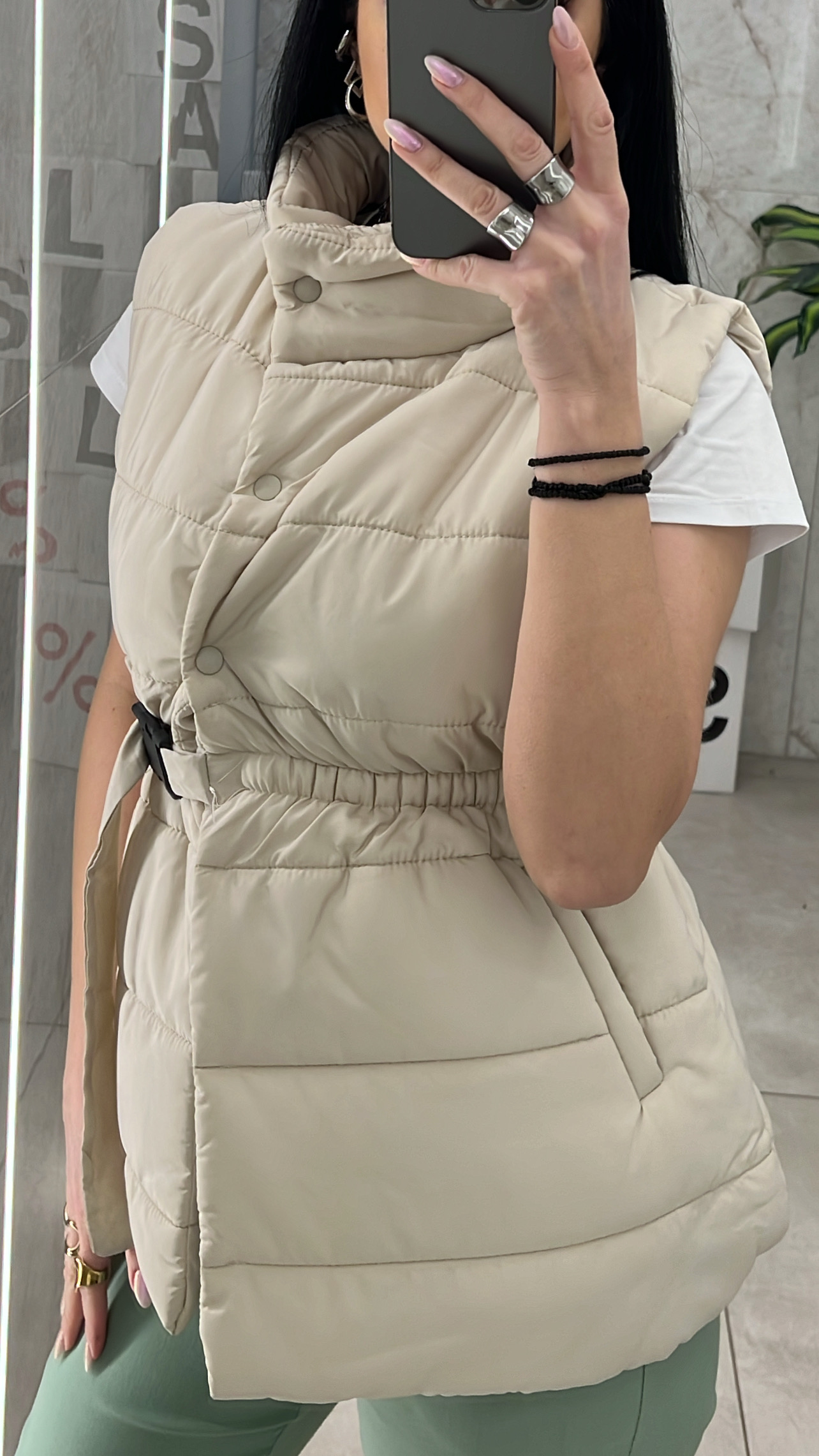 Αμάνικο μπουφάν με λάστιχο στην μέση , διαθέτει δική της ζώνη και τσέπες .Κλείνει με κουμπιά μέχρι την μέση .