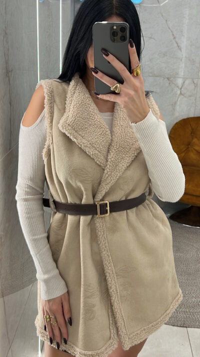Αμάνικο σουέτ  γιλέκο με εσωτερική γούνα έχει δική του ζώνη και διαθέτει και τσέπες