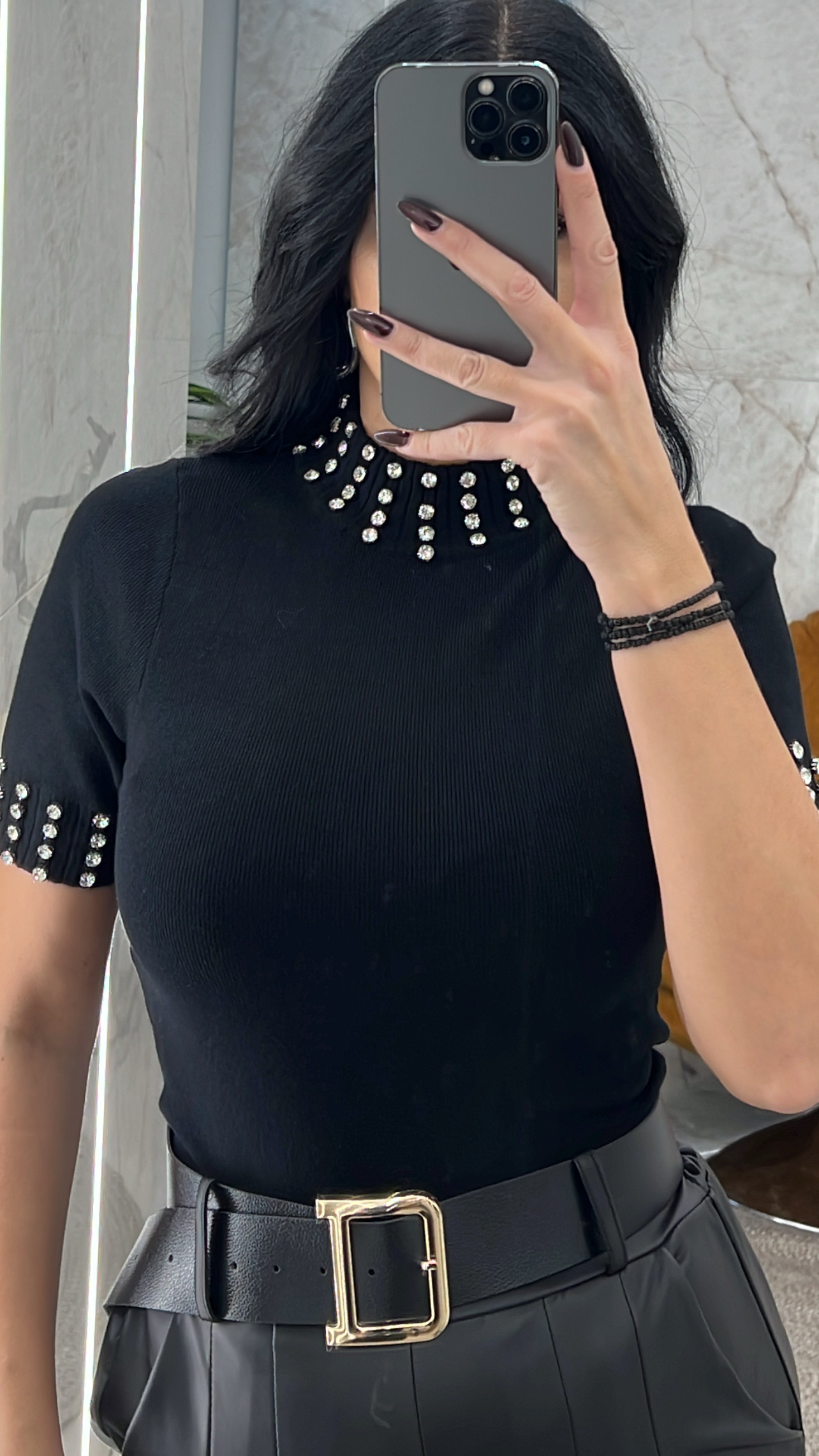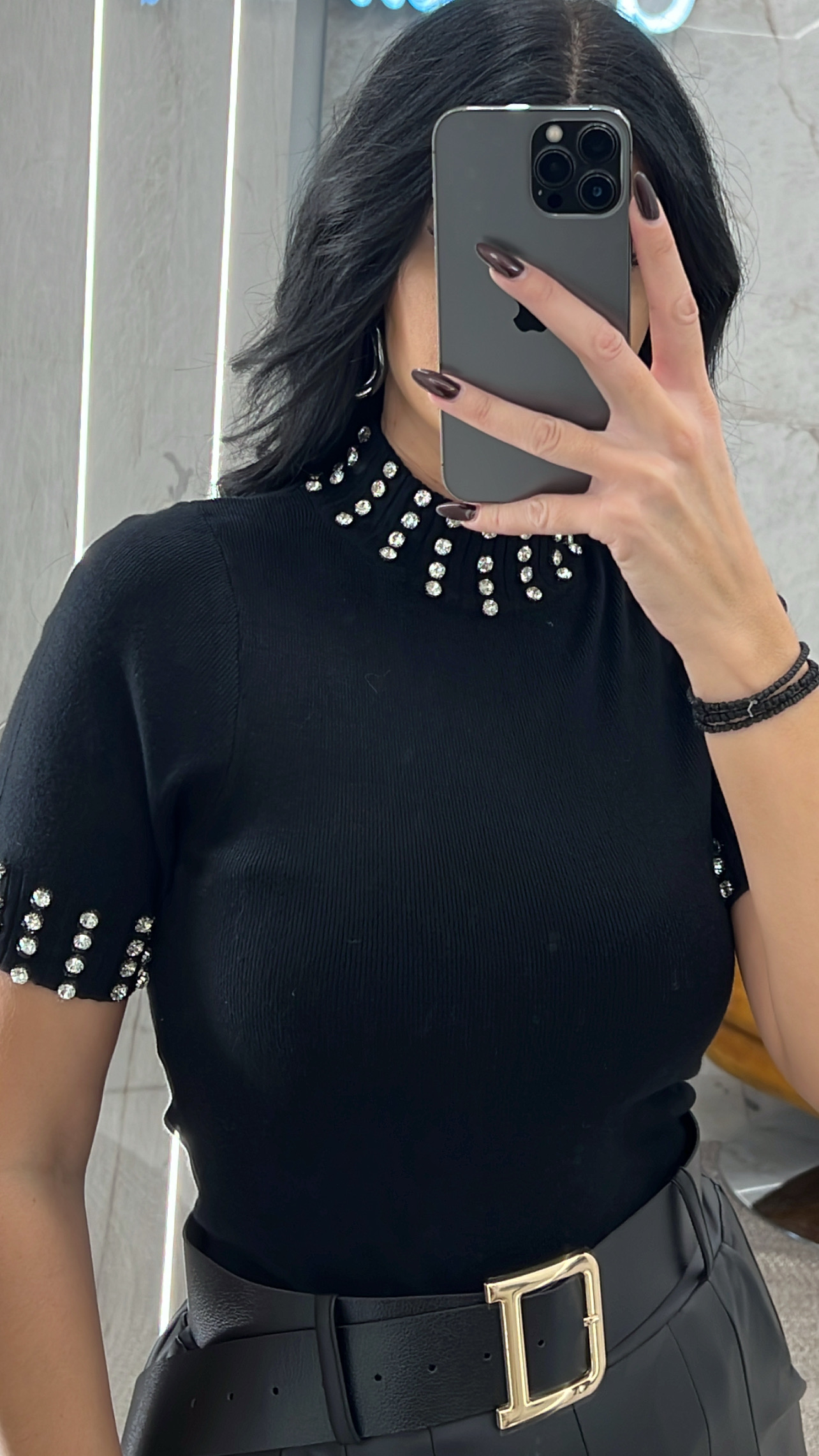 Μπλούζα μάλλινη κοντομάνικη με στρας λεπτομέρειες στα μανίκια και στο ζιβάγκο