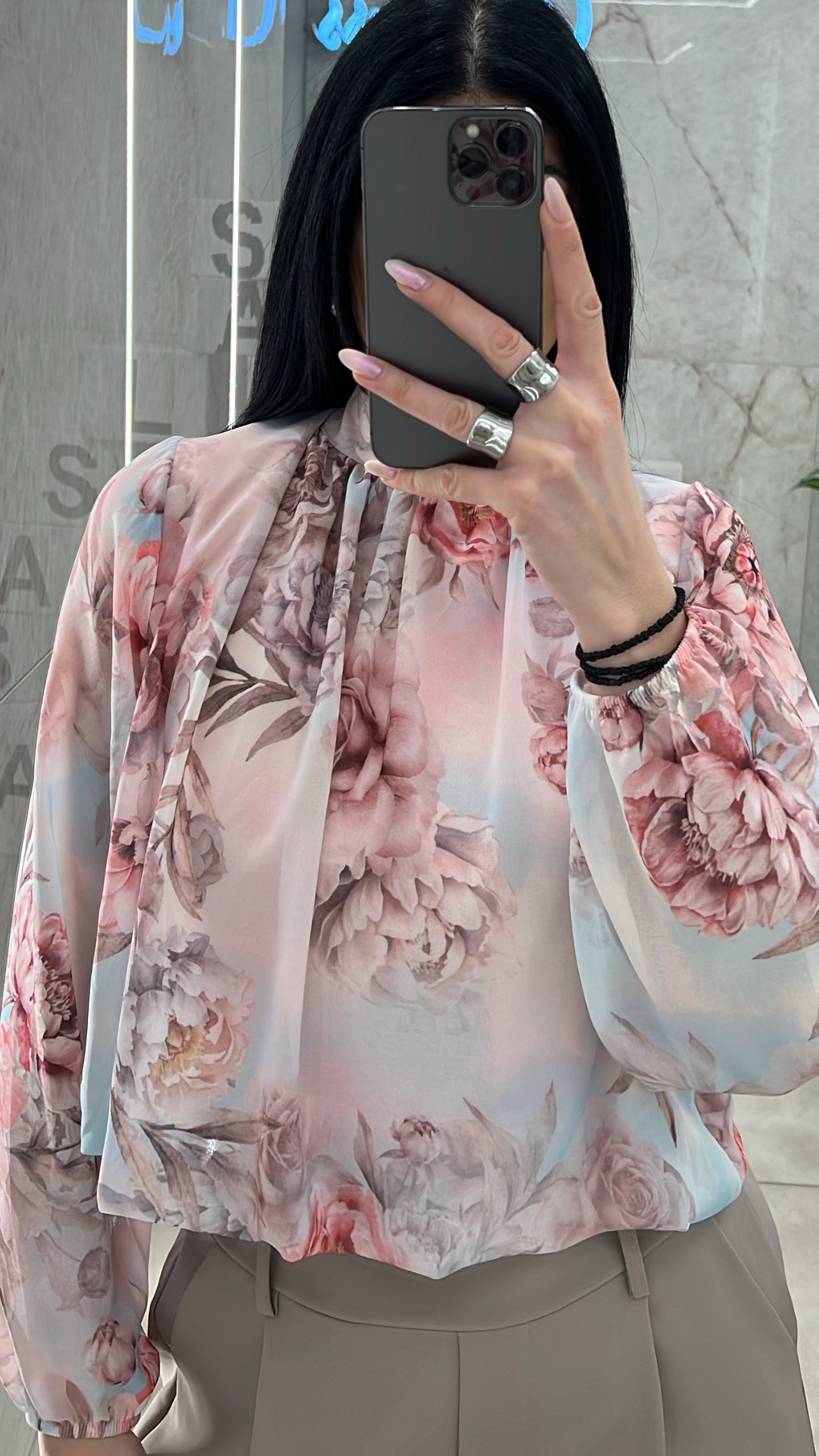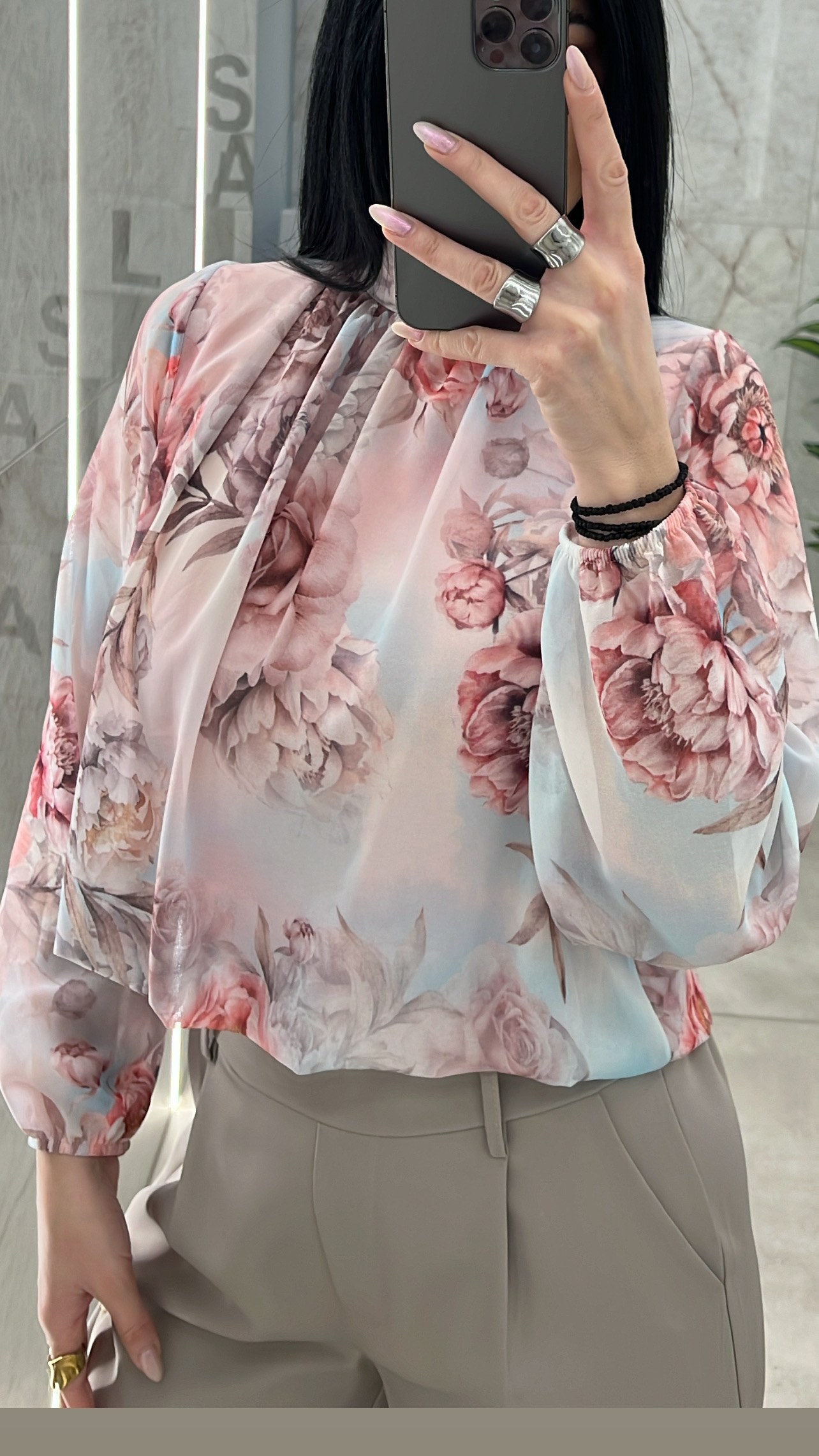 Μπλούζα φλοραλ με λάστιχο στο τελείωμα , διαθέτει φοδρα και κλείνει με κουμπί πισω στον λαιμό.