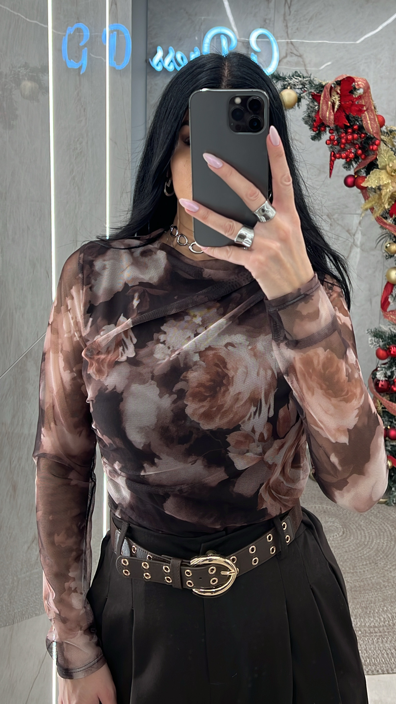 Μπλούζα Floral με Διαφάνεια 0665/Καφέ