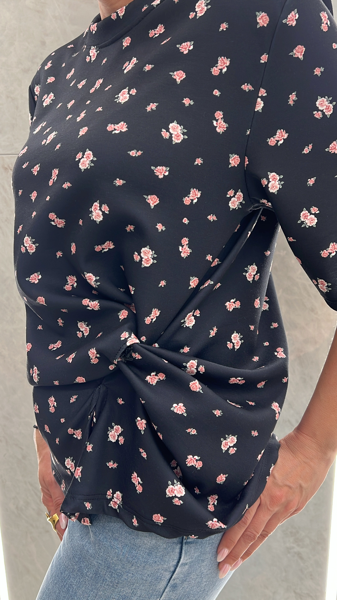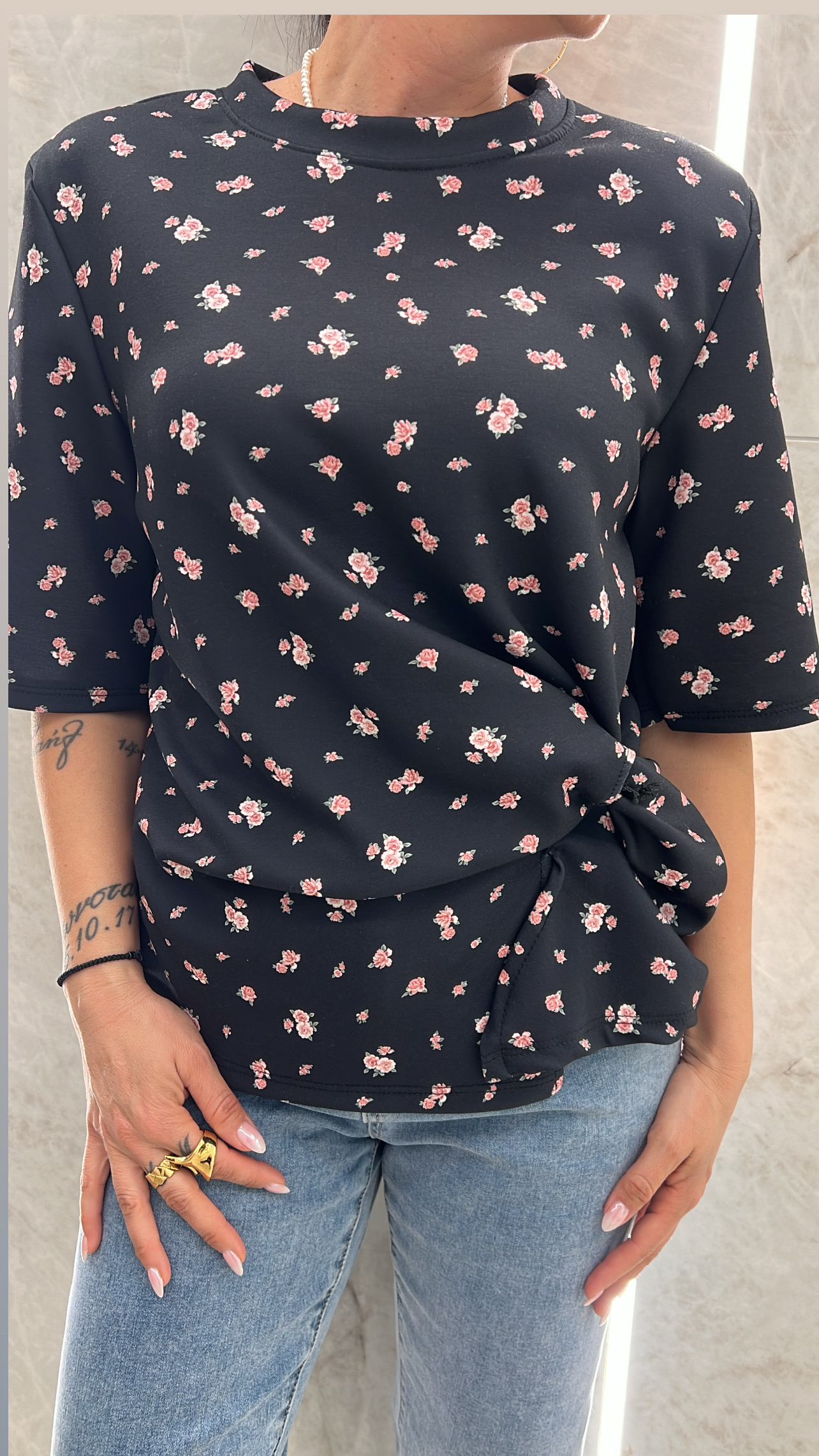 Μπλούζα φλοράλ με βάτες και κόμπο στο πλάι .