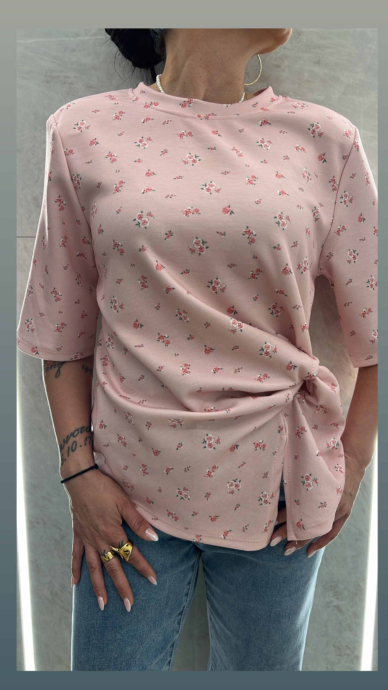 Μπλούζα φλοράλ με βάτες και κόμπο στο πλάι .