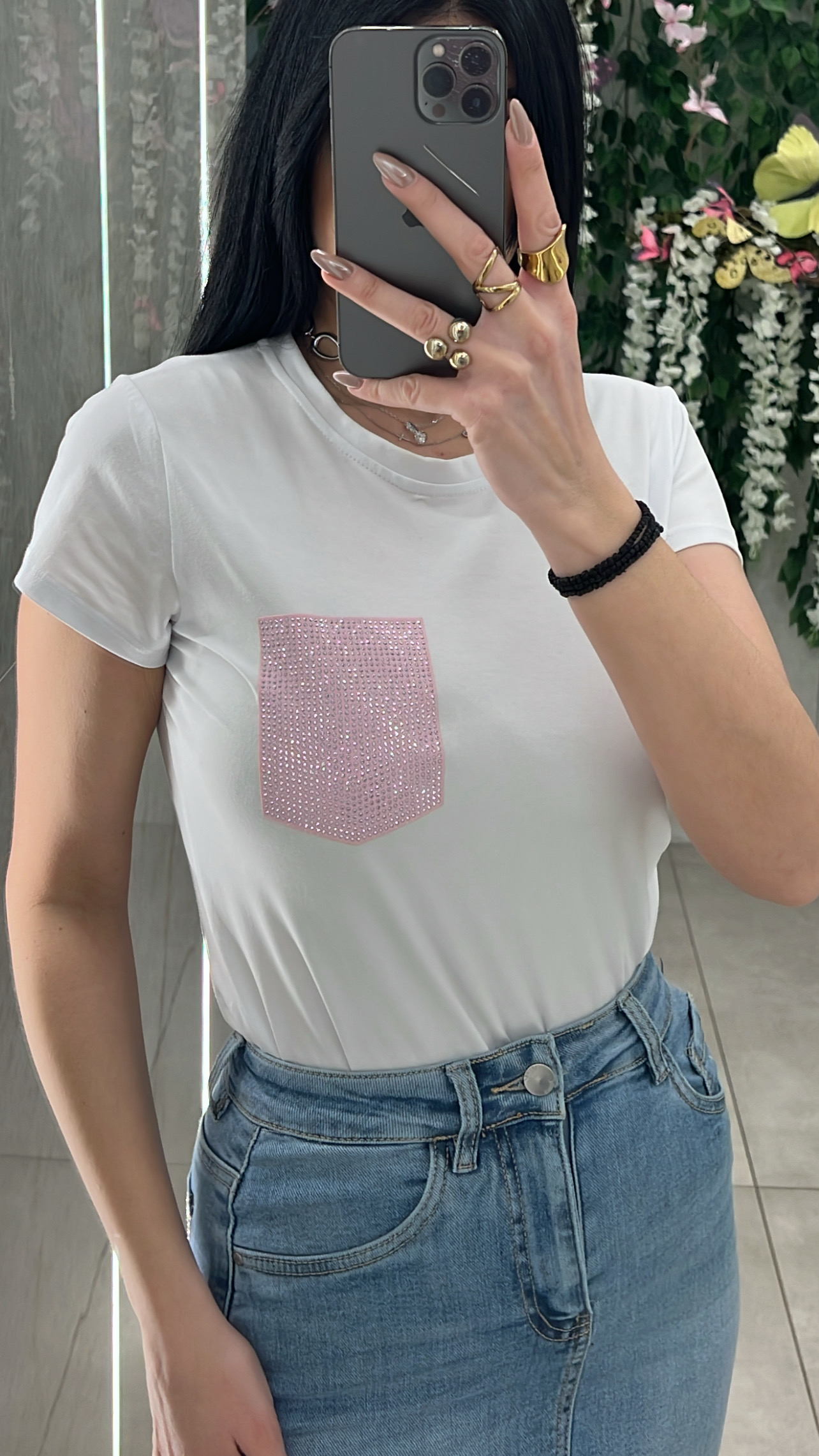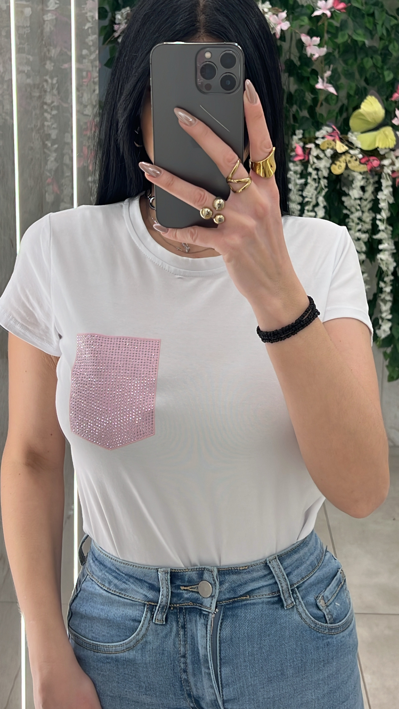 Μπλουζα λευκη κοντομάνικι με διακοσμητικη  τσεπι στρας .