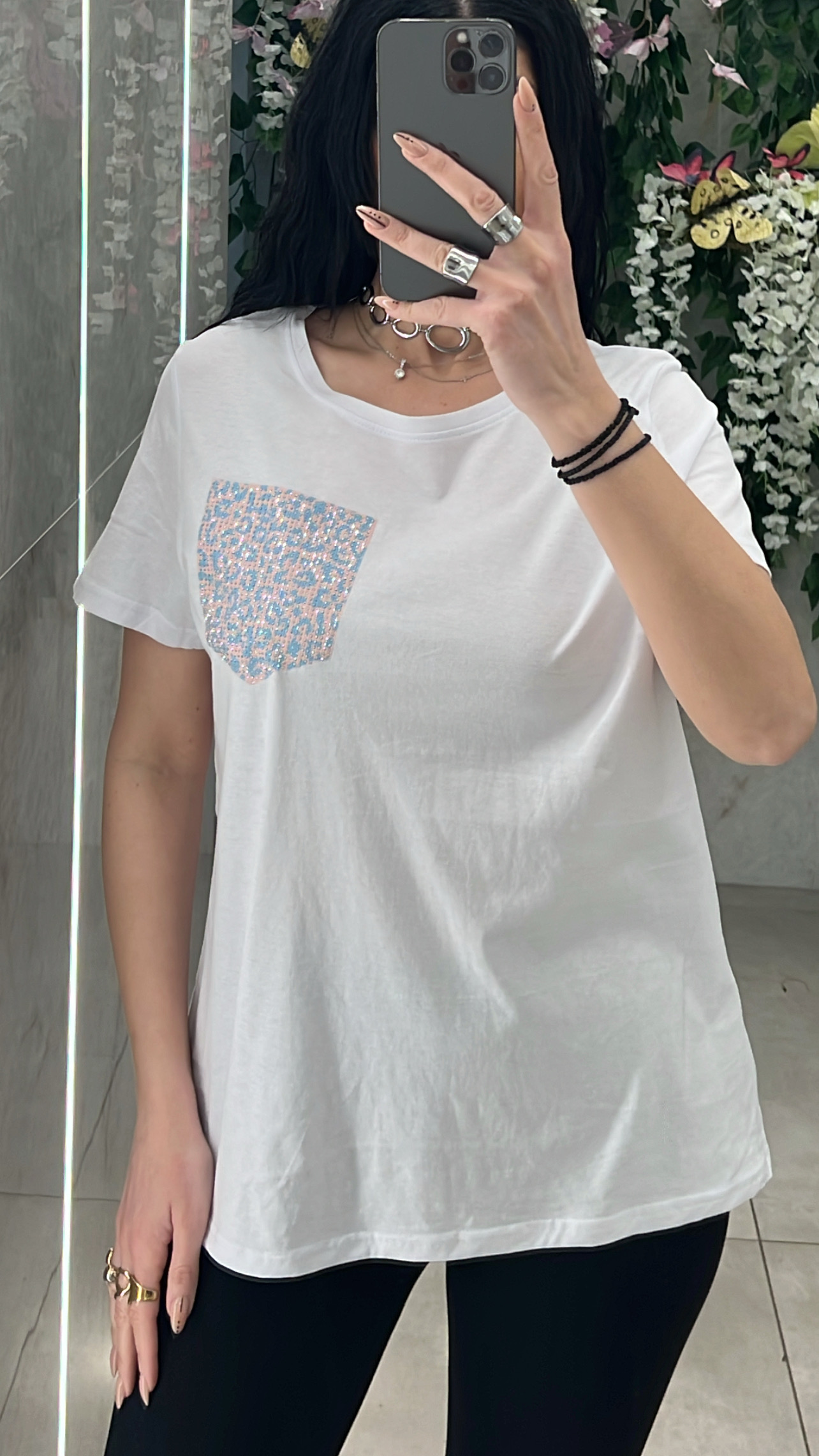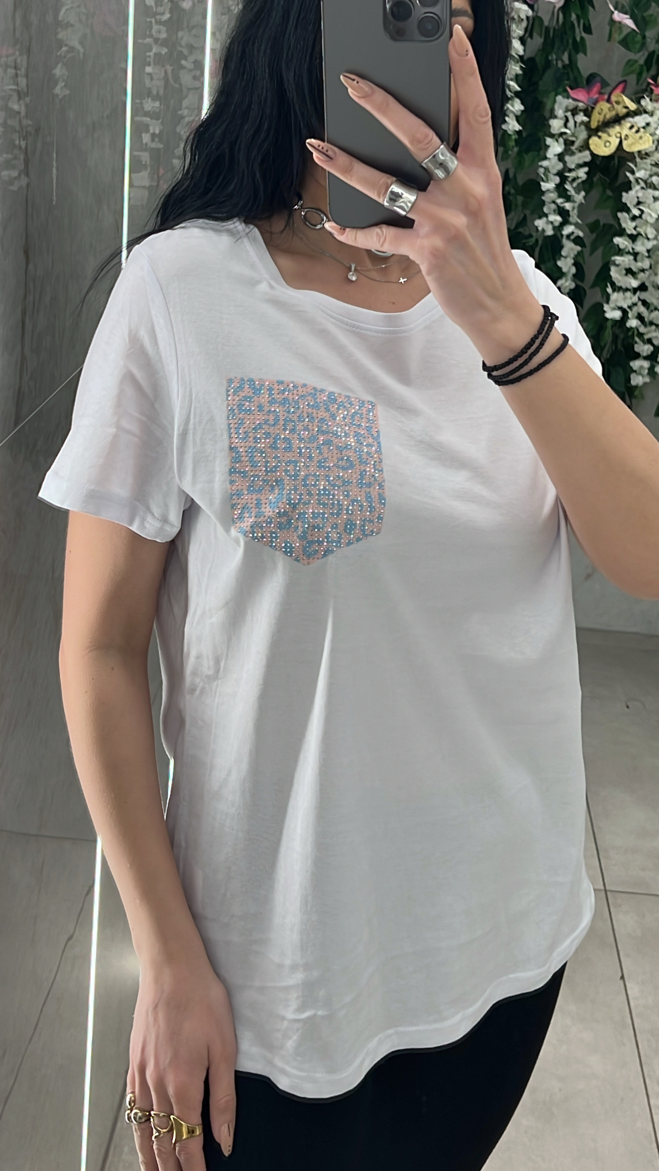 Μπλουζα λευκη κοντομάνικι με διακοσμητικη  τσεπι στρας .