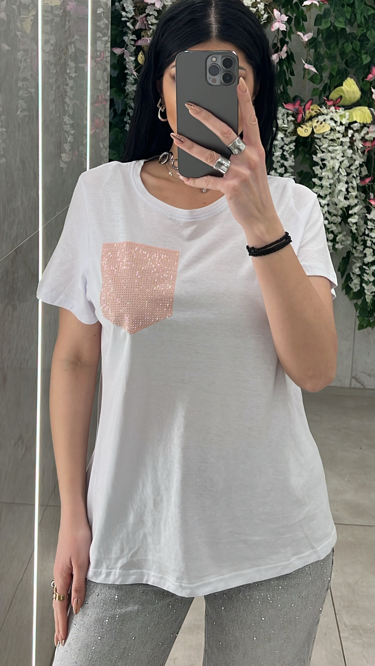 Μπλουζα λευκη κοντομάνικι με διακοσμητικη  τσεπι στρας .