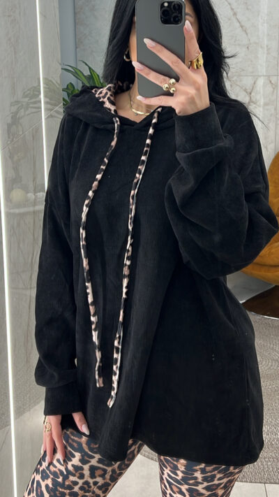 Μπλούζα κοτλέ με κουκούλα και λεοπάρ λεπτομέρειες στη κουκούλα εσωτερικά και κορδόνια