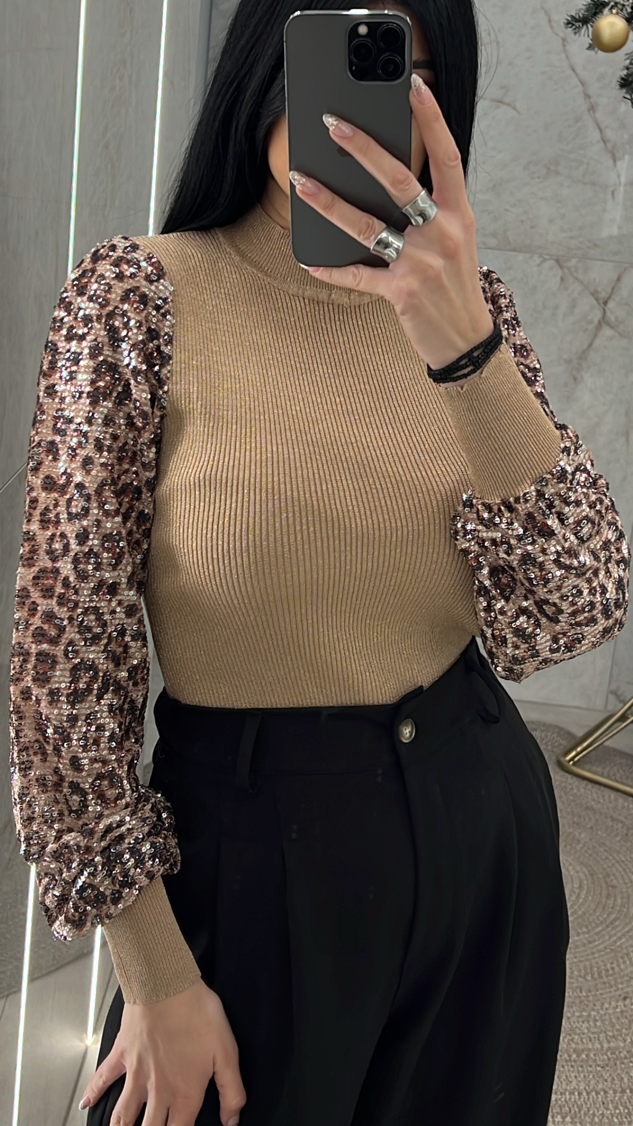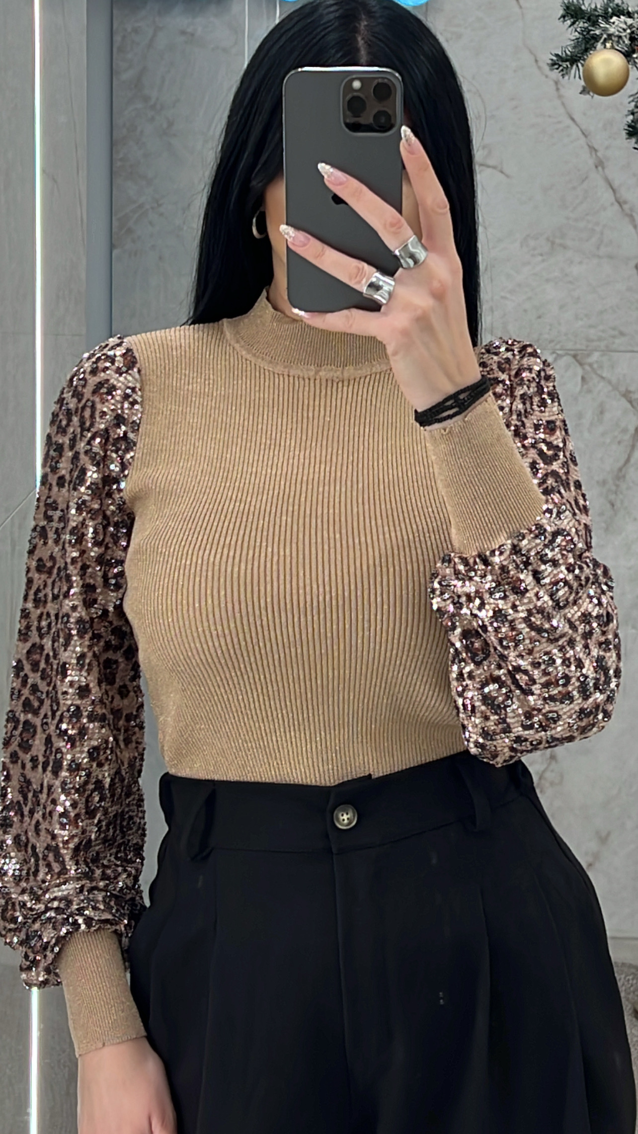Μπλούζα με χρυσοκλωστή και Λεοπάρ παγιέτα μανίκια 18340/Κάμελ