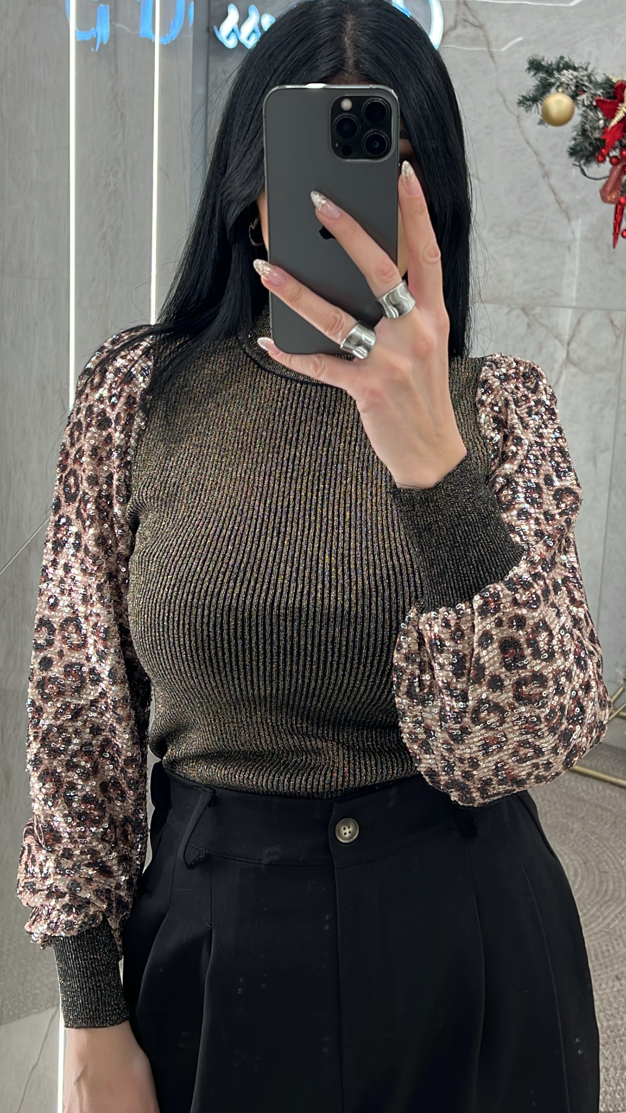 Μπλούζα με χρυσοκλωστή και Λεοπάρ παγιέτα μανίκια