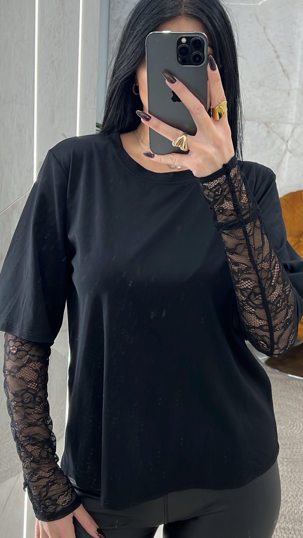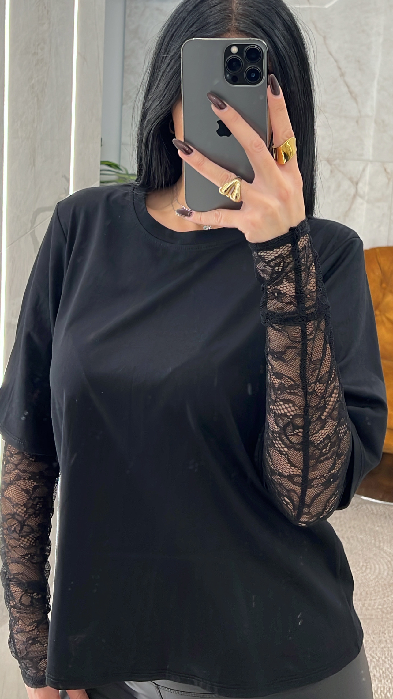 Μπλούζα με μανίκι δαντέλα 11043/Μαύρο