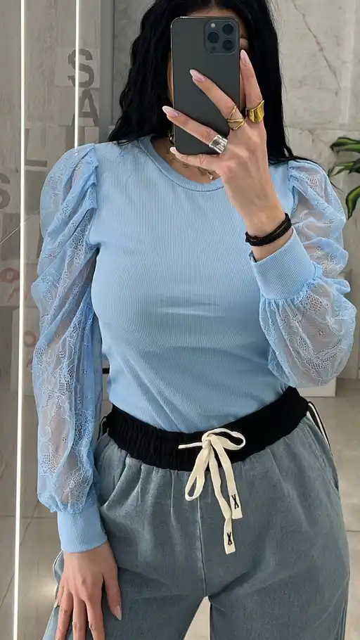 Μπλούζα Με Μανίκι Δαντέλα 22786/Γαλάζιο