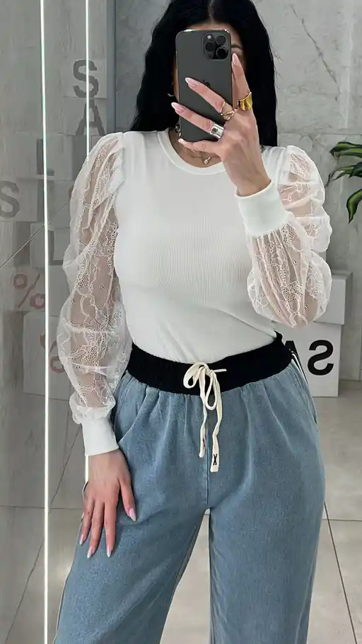 Μπλουζα ριπ με μανίκι δαντέλα .