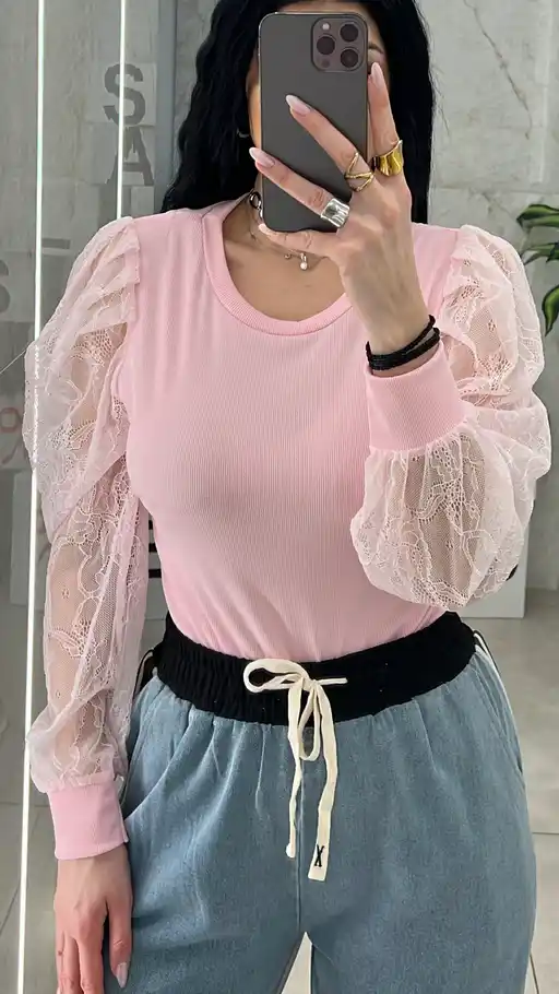 Μπλούζα Με Μανίκι Δαντέλα 22786/Ρόζ