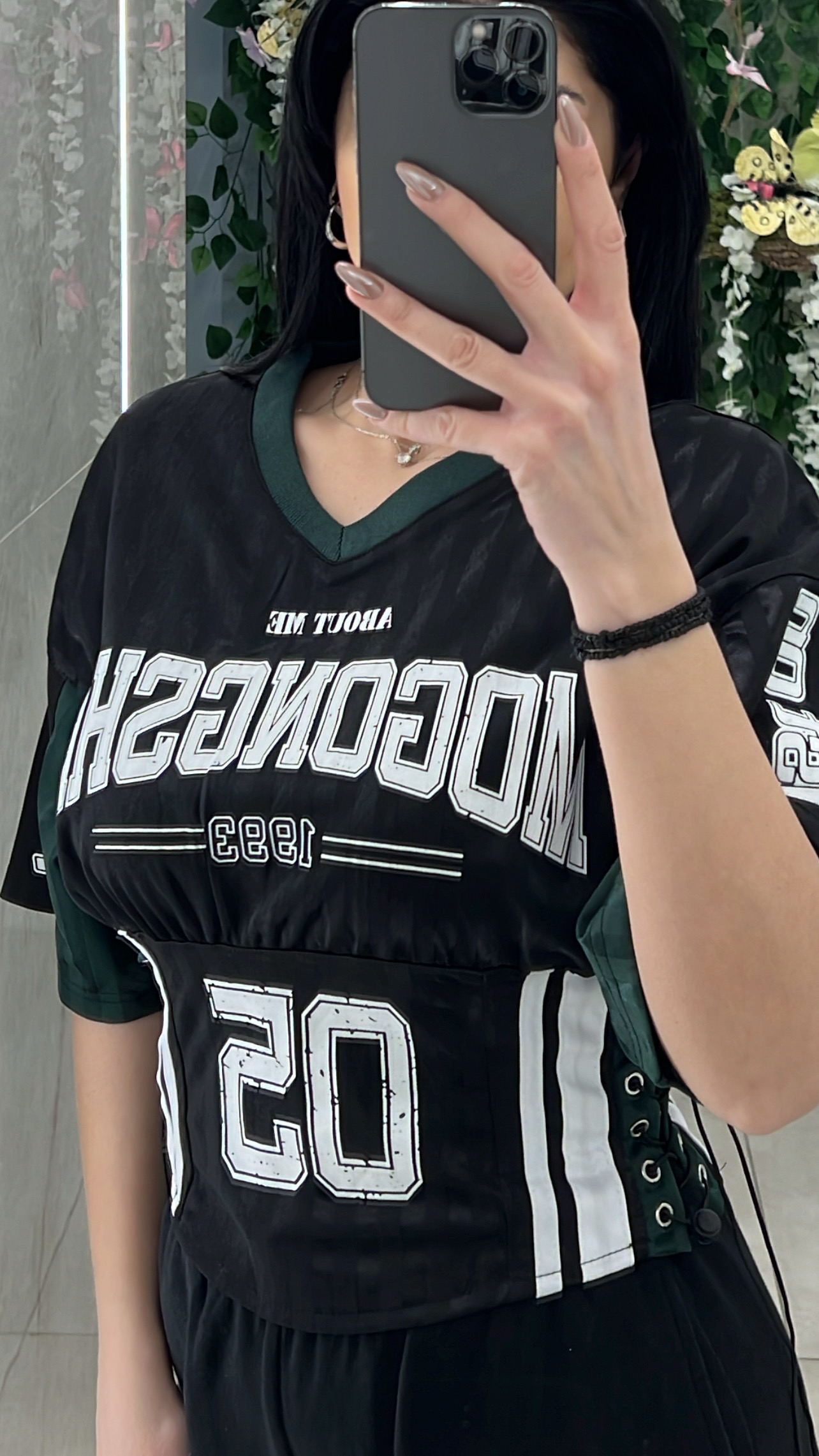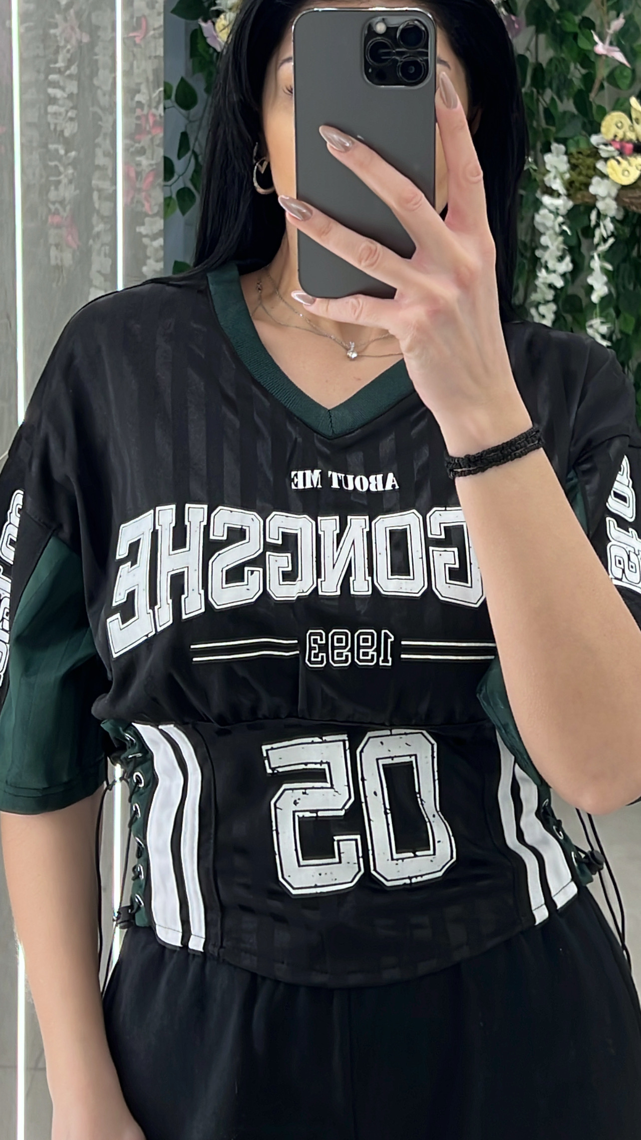 Μπλουζα ριγε κοντομάνικι με στάμπα και βε ,κανει στο τελειωμα σαν κορσε με κορδονια στο πλαι για προσαρμογη .