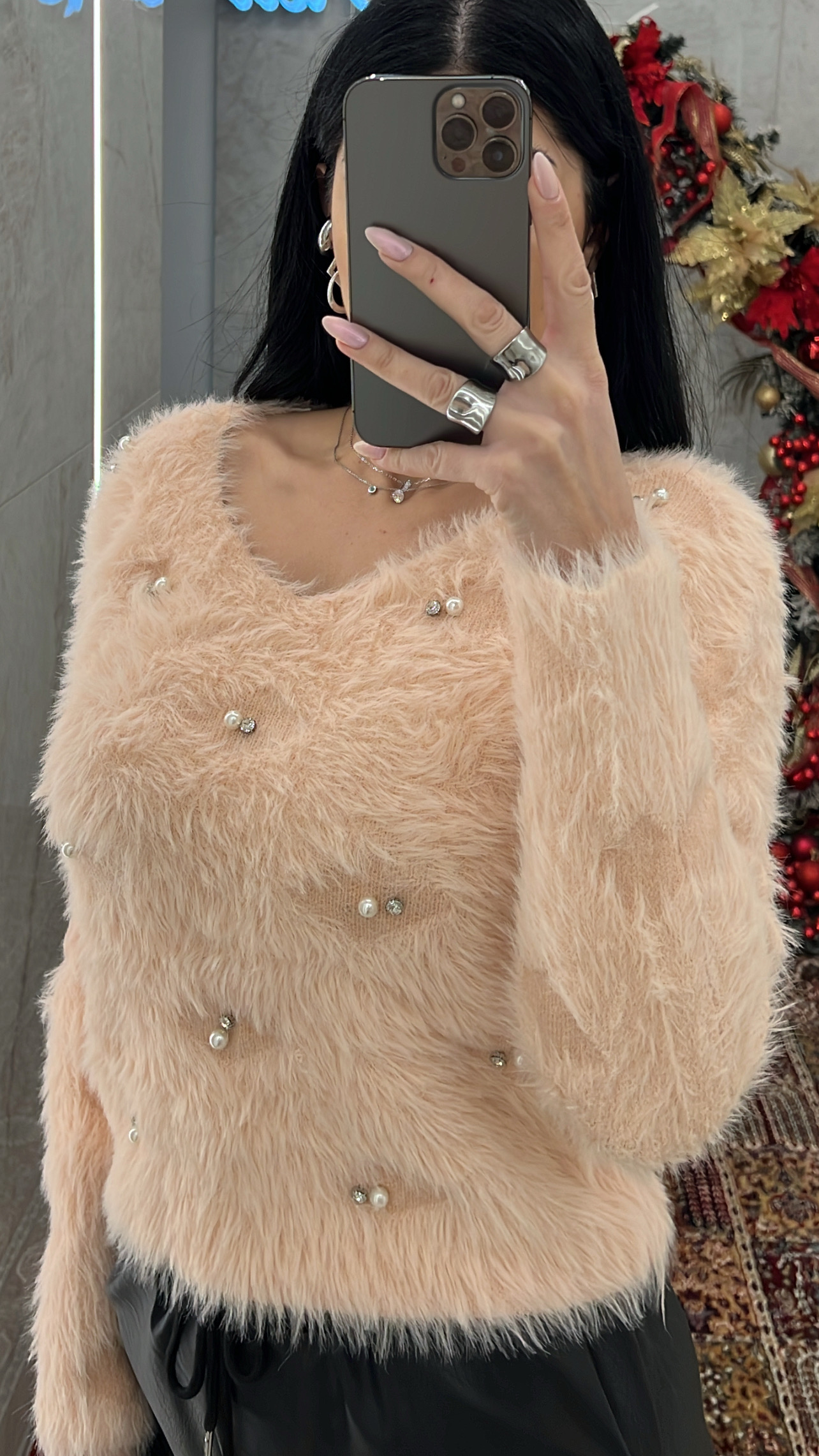 Μπλούζα μοχέρ με πέρλες και στρας