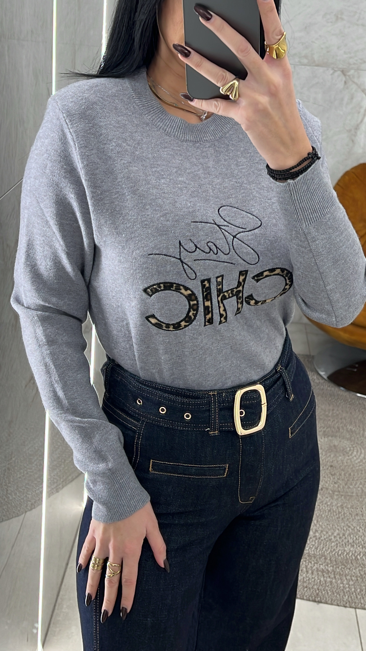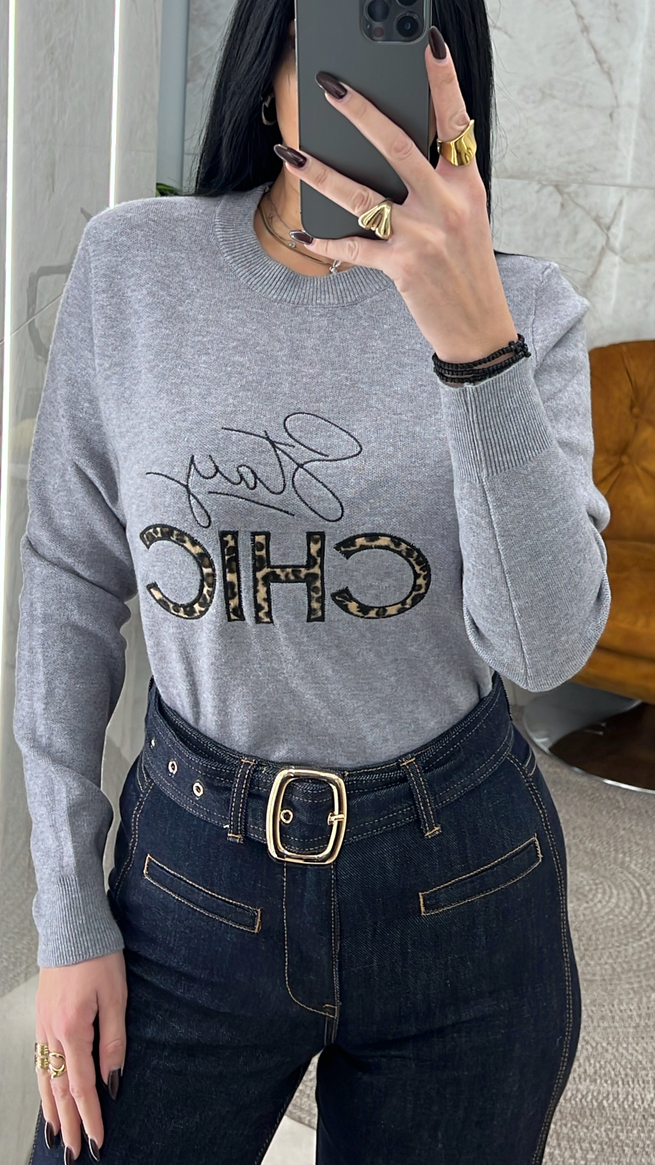 Μπλούζα γκρι πλεκτή με print λεοπάρ