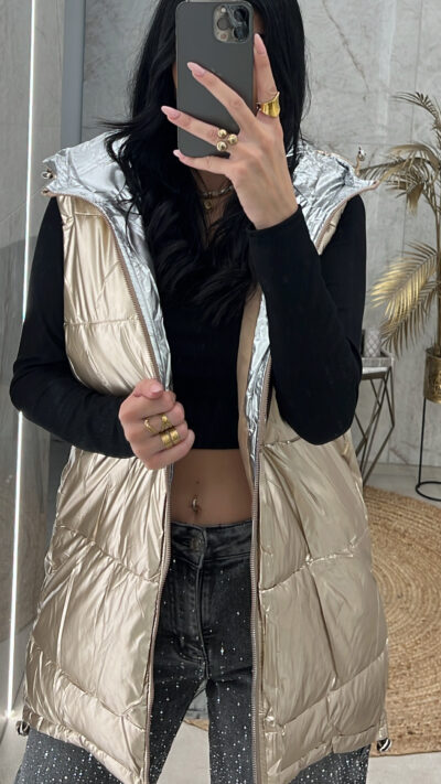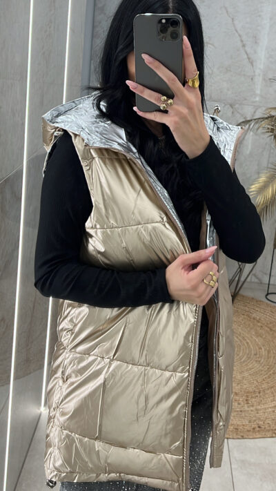 Μπουφάν αμάνικο ροζ χρυσό μεταλιζέ με λεπτομέρειες ασημί στο τελείωμα έχει λάστιχο που μπορείτε να το κάνετε bomber