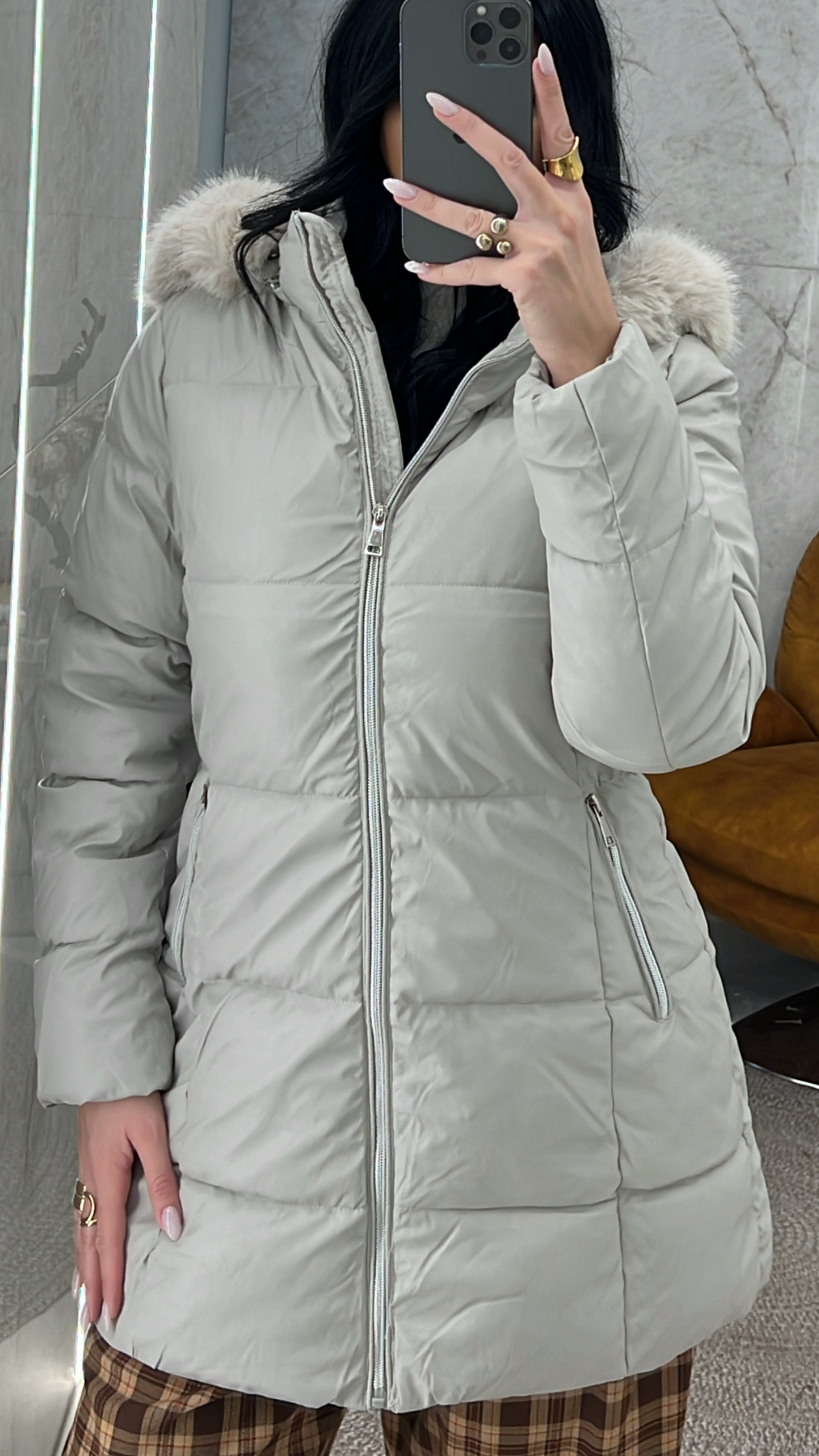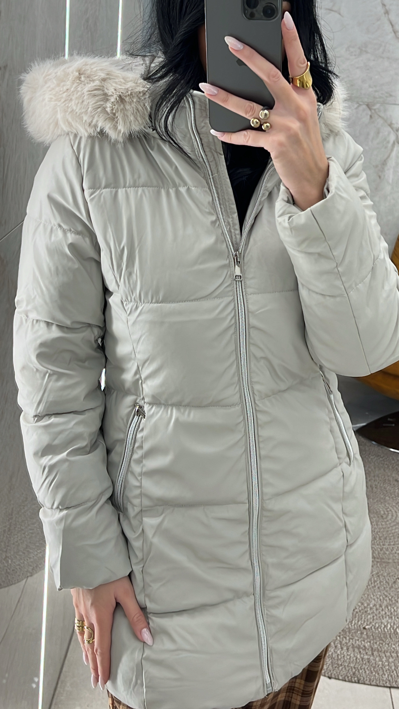 Mπουφάν δερματίνη με κουκούλα με γούνα. Κλείνει με φερμουάρ, φερμουάρ διαθέτει και στις τσέπες και η γούνα όπως και η κουκούλα μπορεί να αφαιρεθεί.