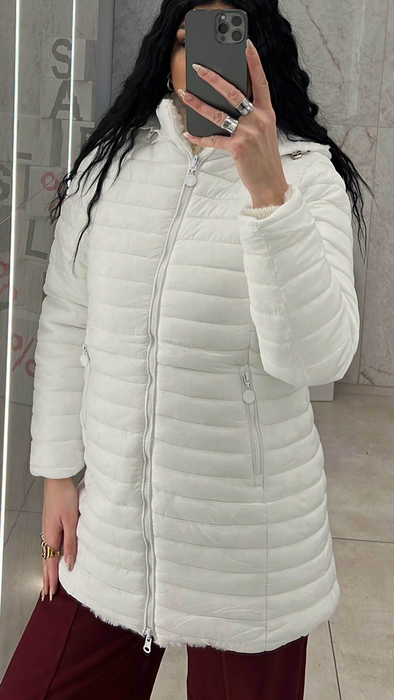 Μπουφάν διπλής όψεως.Είναι ύφασμα από την μία μεριά και γούνα από την άλλη.Κλείνει με φερμουάρ και η  κουκούλα μπορεί να αφαιρεθεί