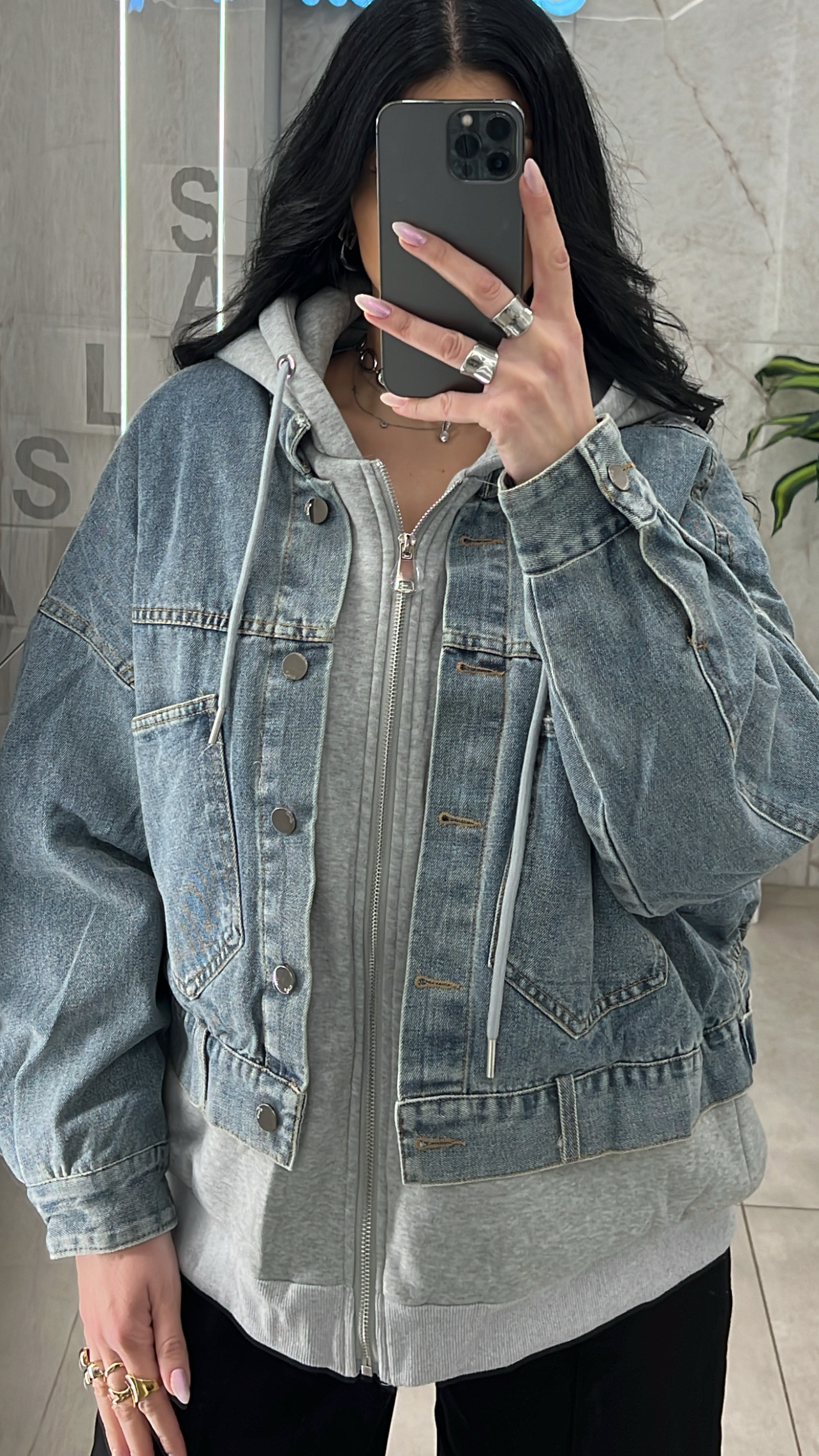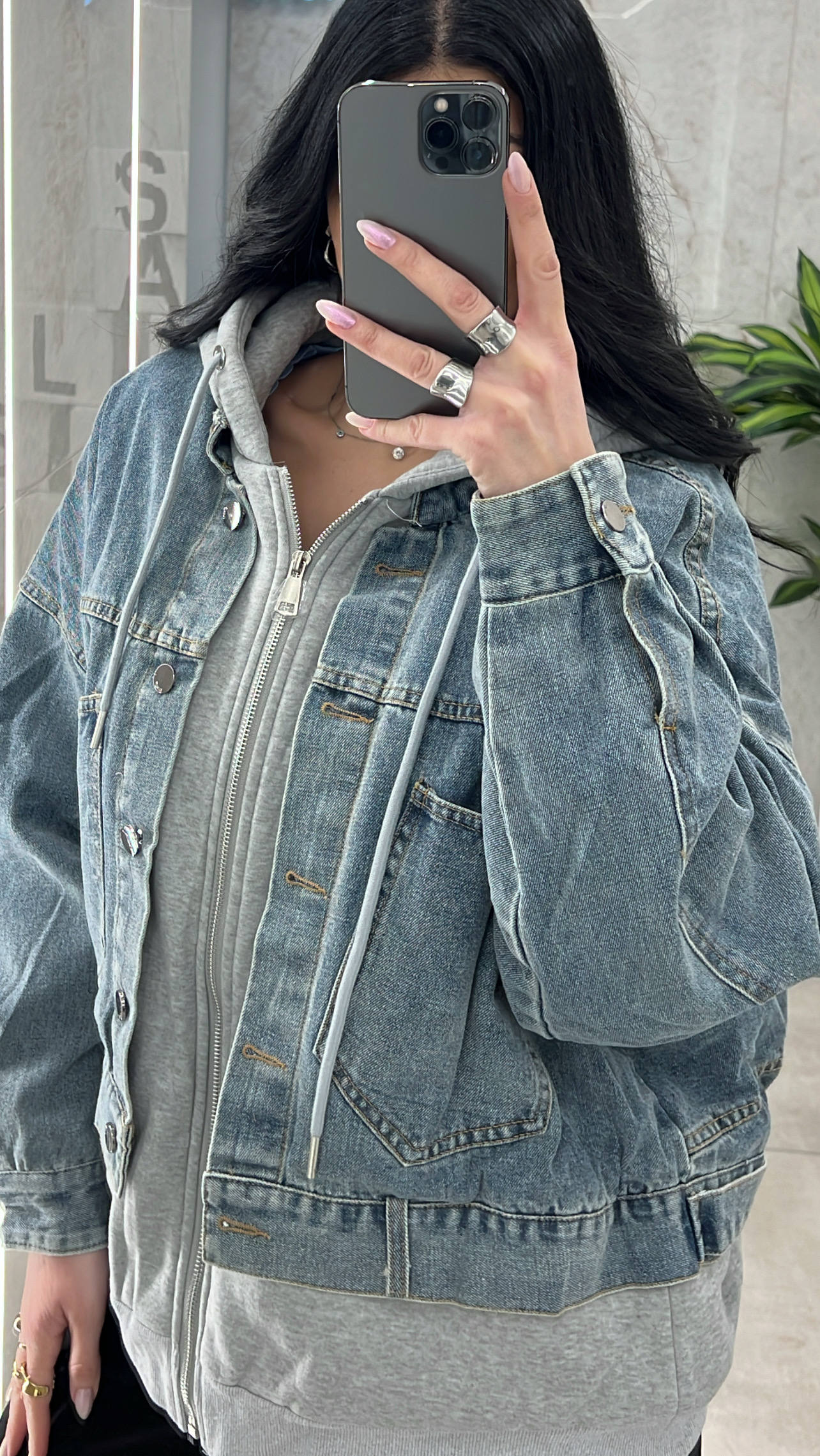 Μπουφάν τζίν με ενσωματομένη ζακέτα , εχει εσωτερική επένδυση γούνα, διαθέτει κουκούλα ,τσέπες και κλείνει με κουμπιά και φερμουάρ .