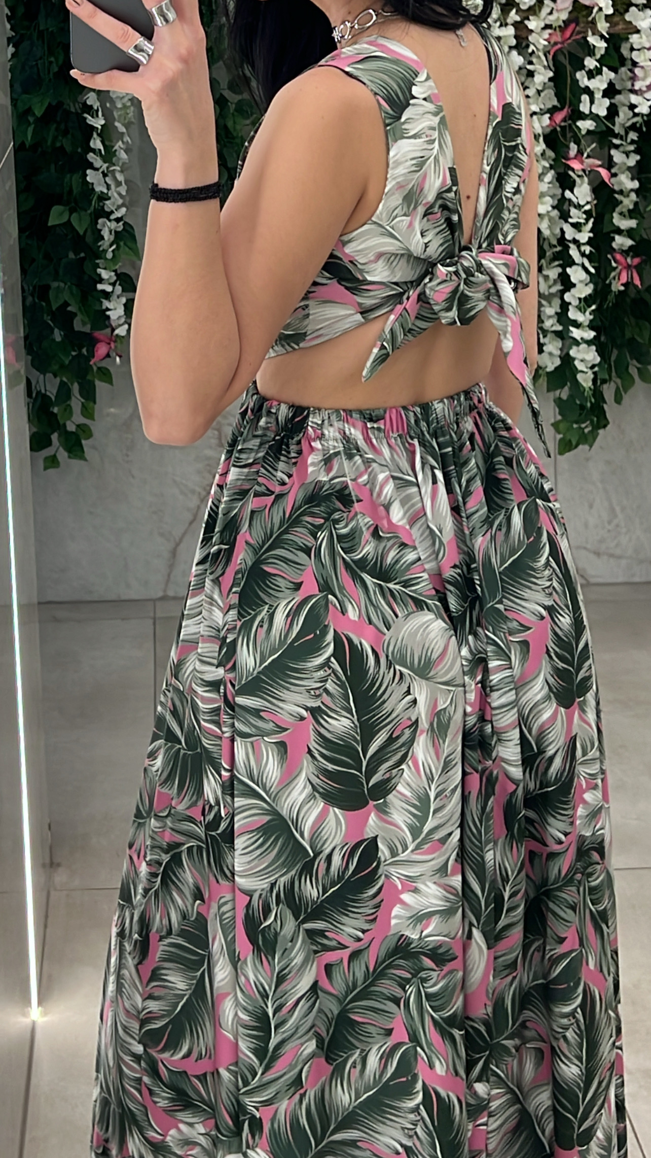 Φλοραλ φόρεμα με σκισιμο στα ποδια , εχει λάστιχο στην μέση και δένει πισω στην πλατη .