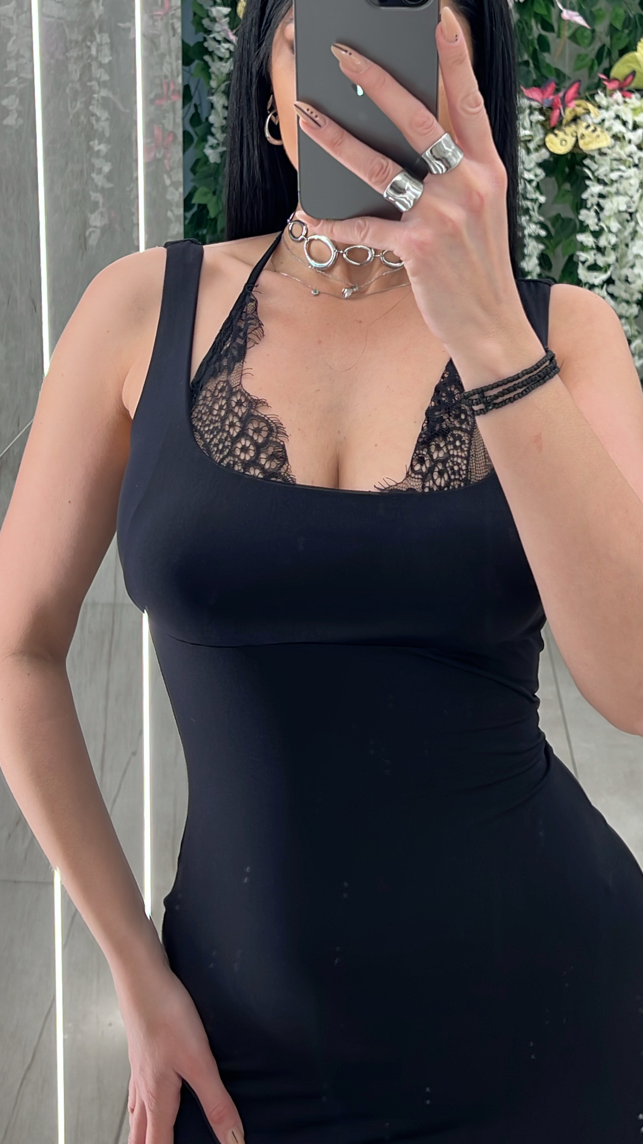 Φόρεμα λικρα με καπς στο στηθος  και ενσωματομενη δαντελα που δενει στον λαιμο ..