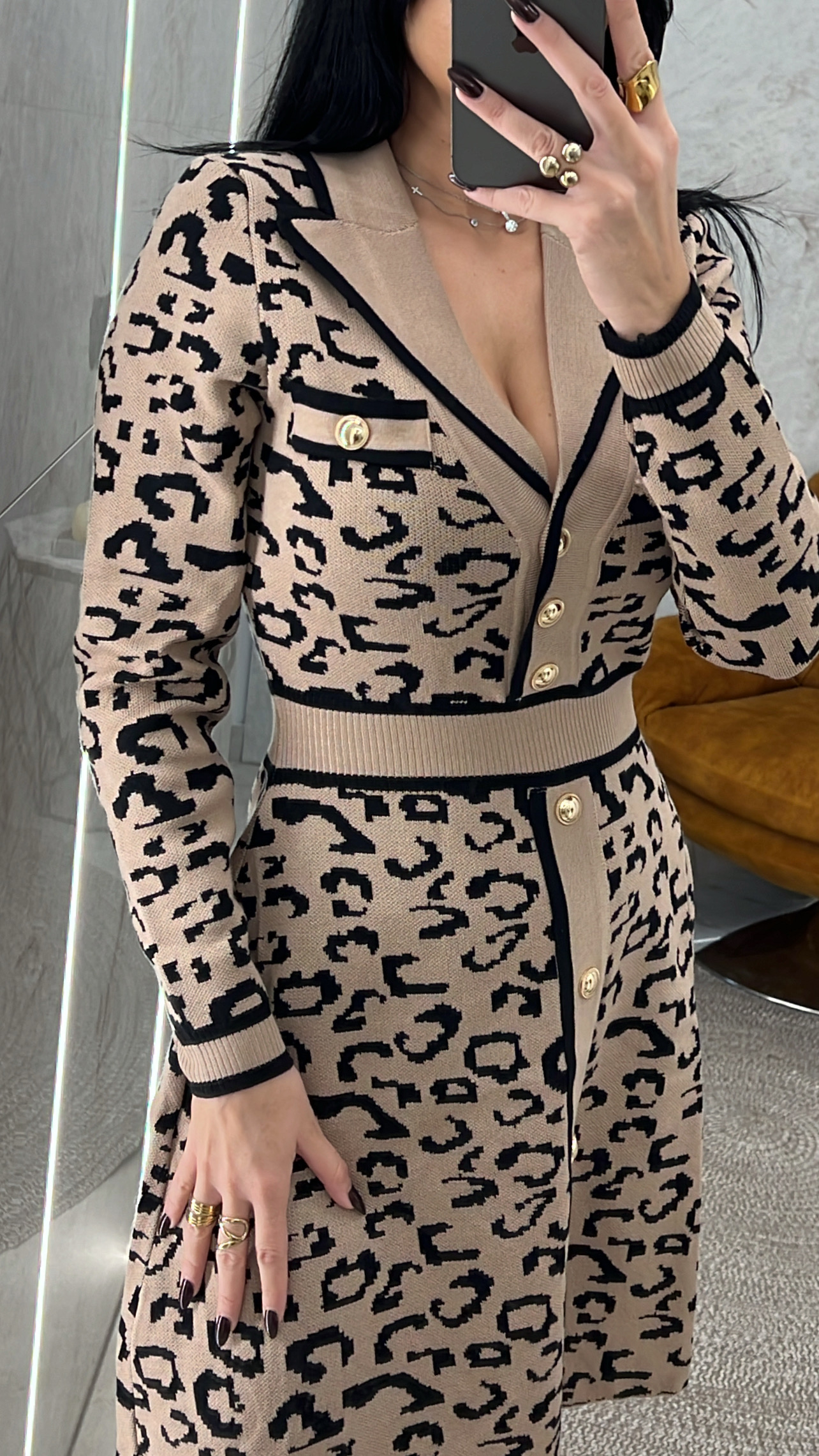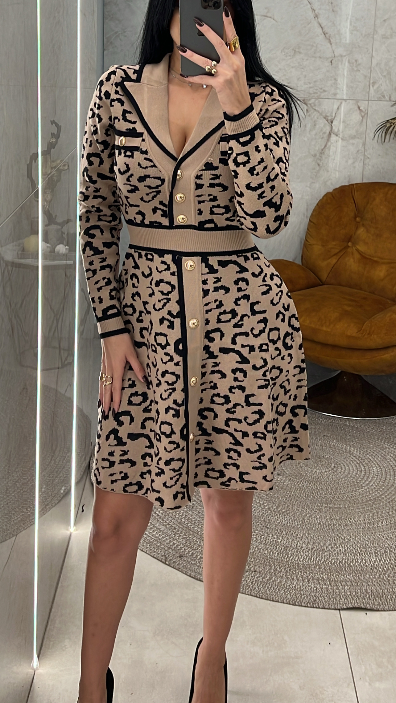Φόρεμα πλεκτό Λεοπάρ μπεζ μαύρο με γιακά , είναι εφαρμοστό στήθος και κάτω ανοίγει , έχει χρυσά διακοσμητικά κουμπιά