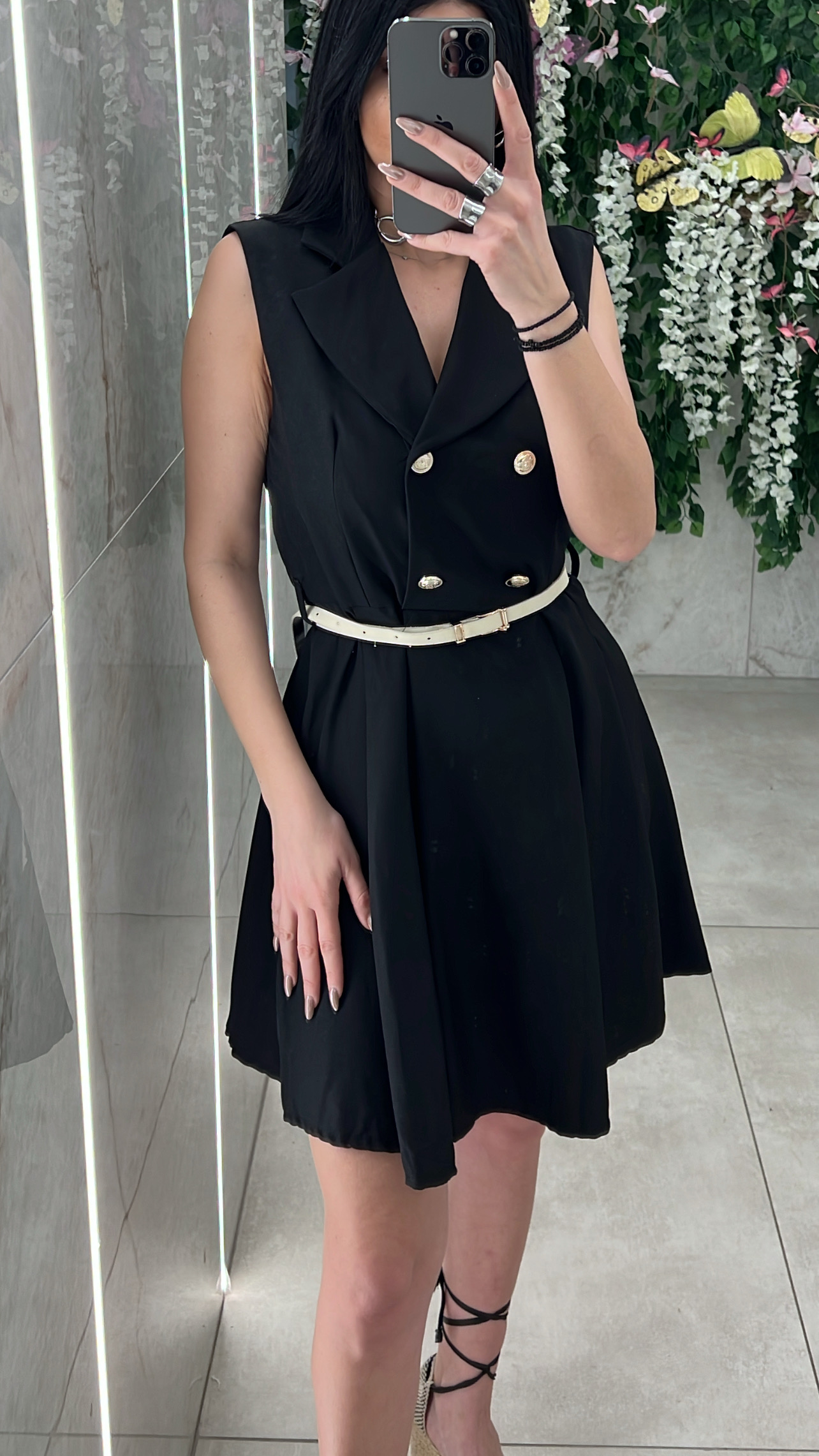 Φόρεμα κοντο αμανικο  με δικη του ζωνη ,χρυσα κουμπια , λαστιχο στην μέση και γιακα .