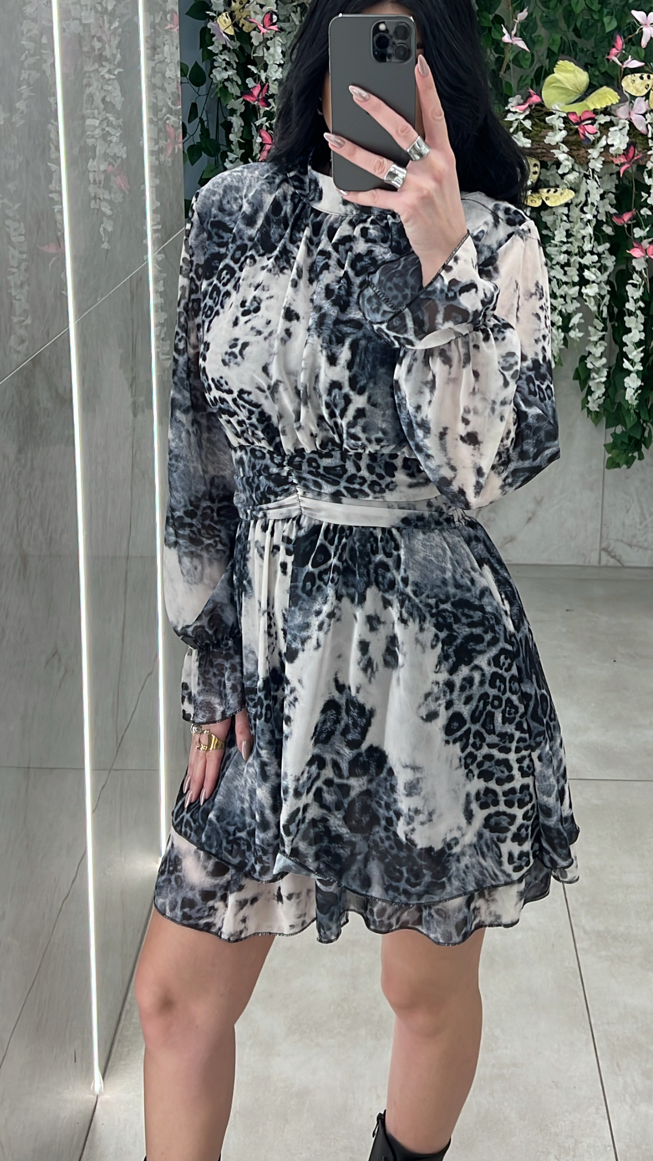 Φόρεμα εμπριμέ με λάστιχο και βολάν  στα μανίκια , κλεινει πισω στον λαιμο με κουμπι ,ειναι φοδραρισμενο ,εχει λάστιχο πισω στην μέση και η φουστα κανει βολαν στο τελειωμα .