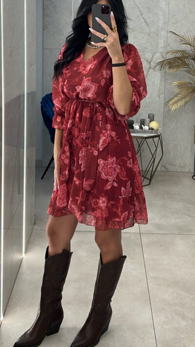 Φόρεμα εμπριμέ μπορντώ διαθέτει λάστιχο στην μέση και δικό του ζωνάκι έχει φόδρα από μέσα