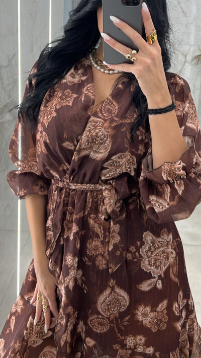 1. Φόρεμα εμπριμέ καφέ διαθέτει λάστιχο στην μέση και δικό του ζωνάκι έχει φόδρα από μέσα