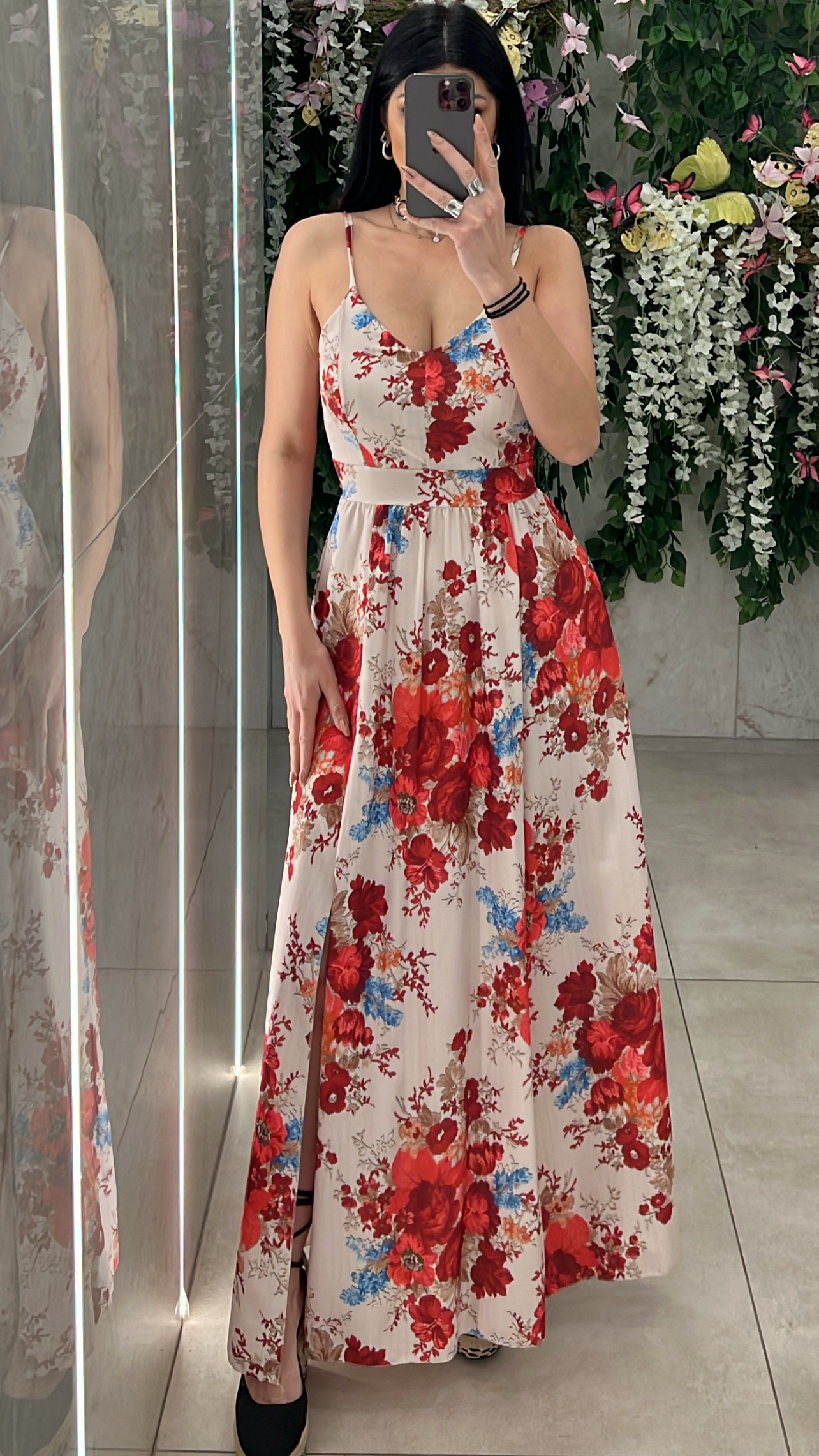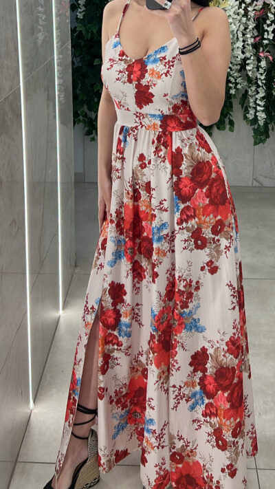 Φόρεμα φλοραλ με καπς στο στήθος, δένει πισω στην πλάτη ,εχει σκίσιμο και στα δυο πόδια και διαθέτει λάστιχο στην μέση .