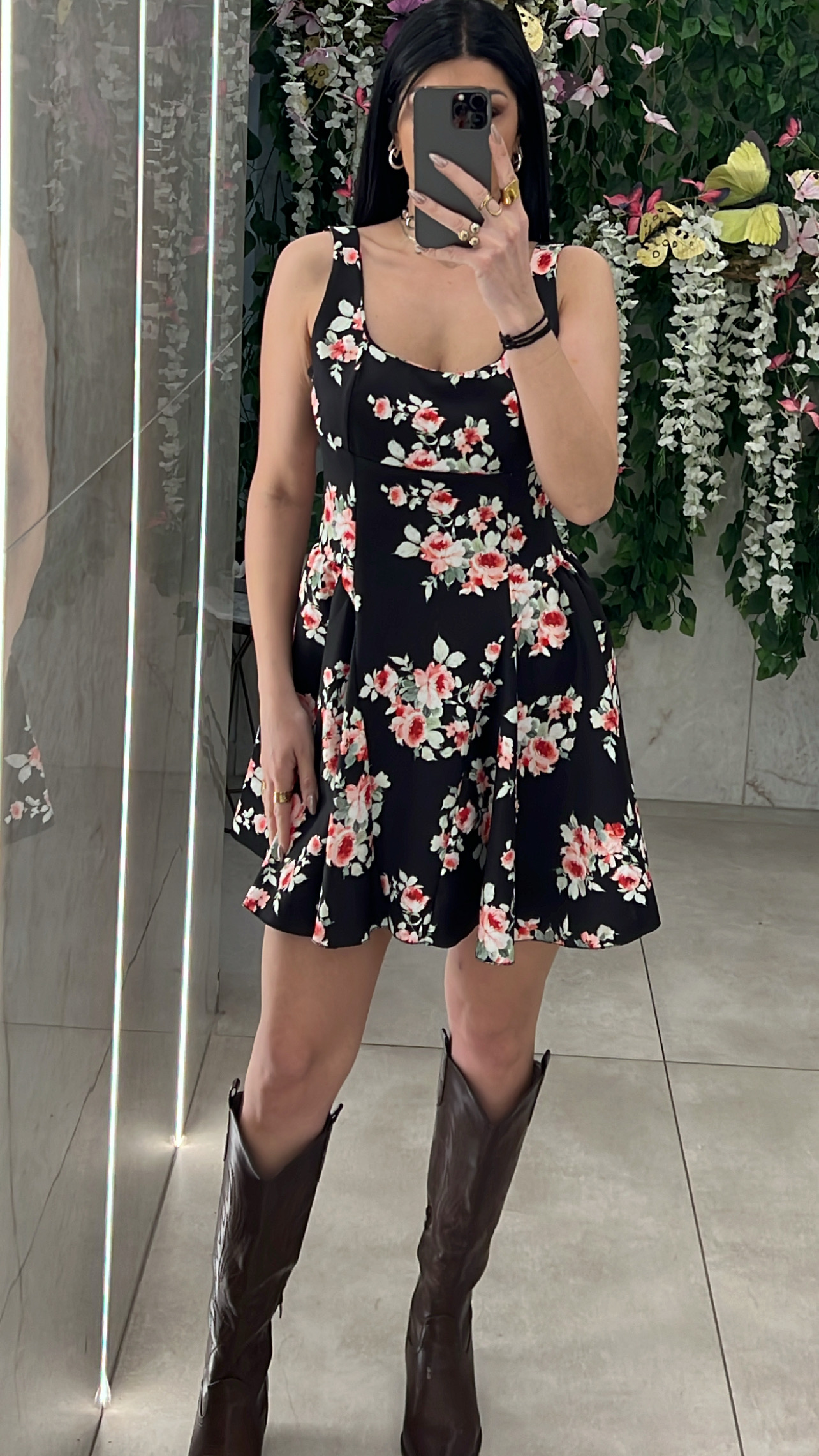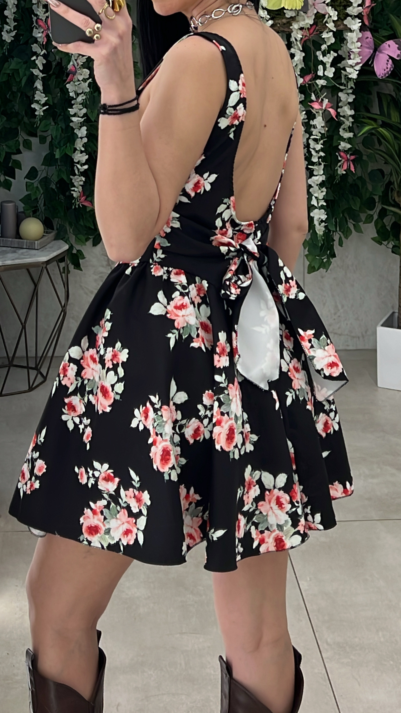 Φόρεμα κοντο φλοραλ , με ανοιχτη πλατη , καπς στο στηθος ,διαθετει φερμουαρ και δένει στην πλατη .
