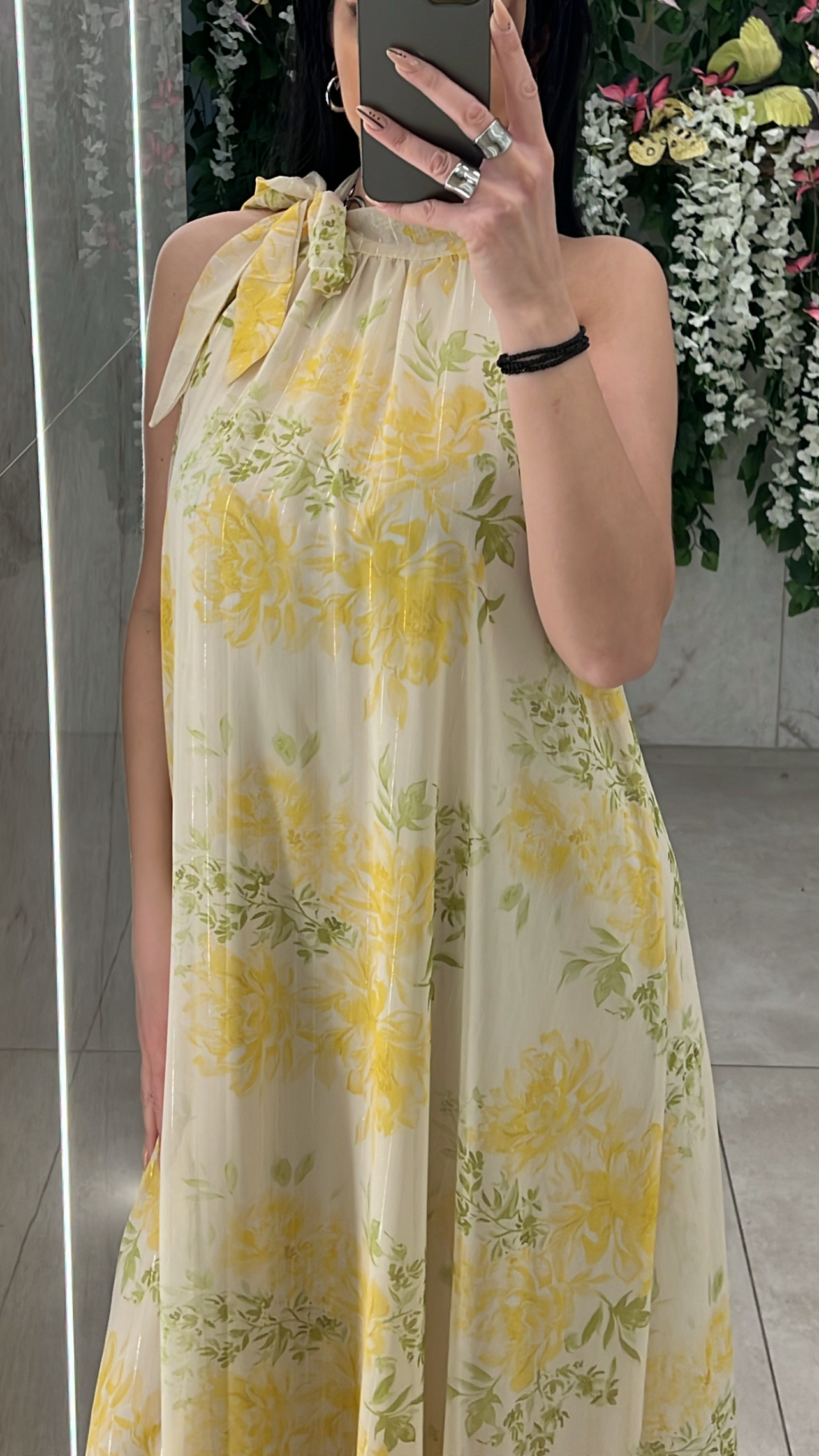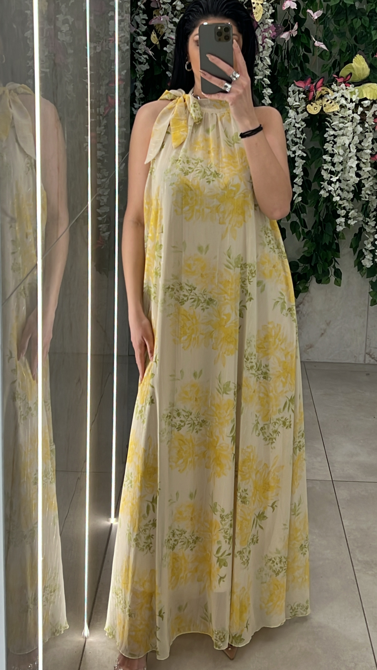 Φόρεμα φλοράλ , διαθέτει εσωτερική φόδρα , δική της ζώνη και δένει στον λαιμο .