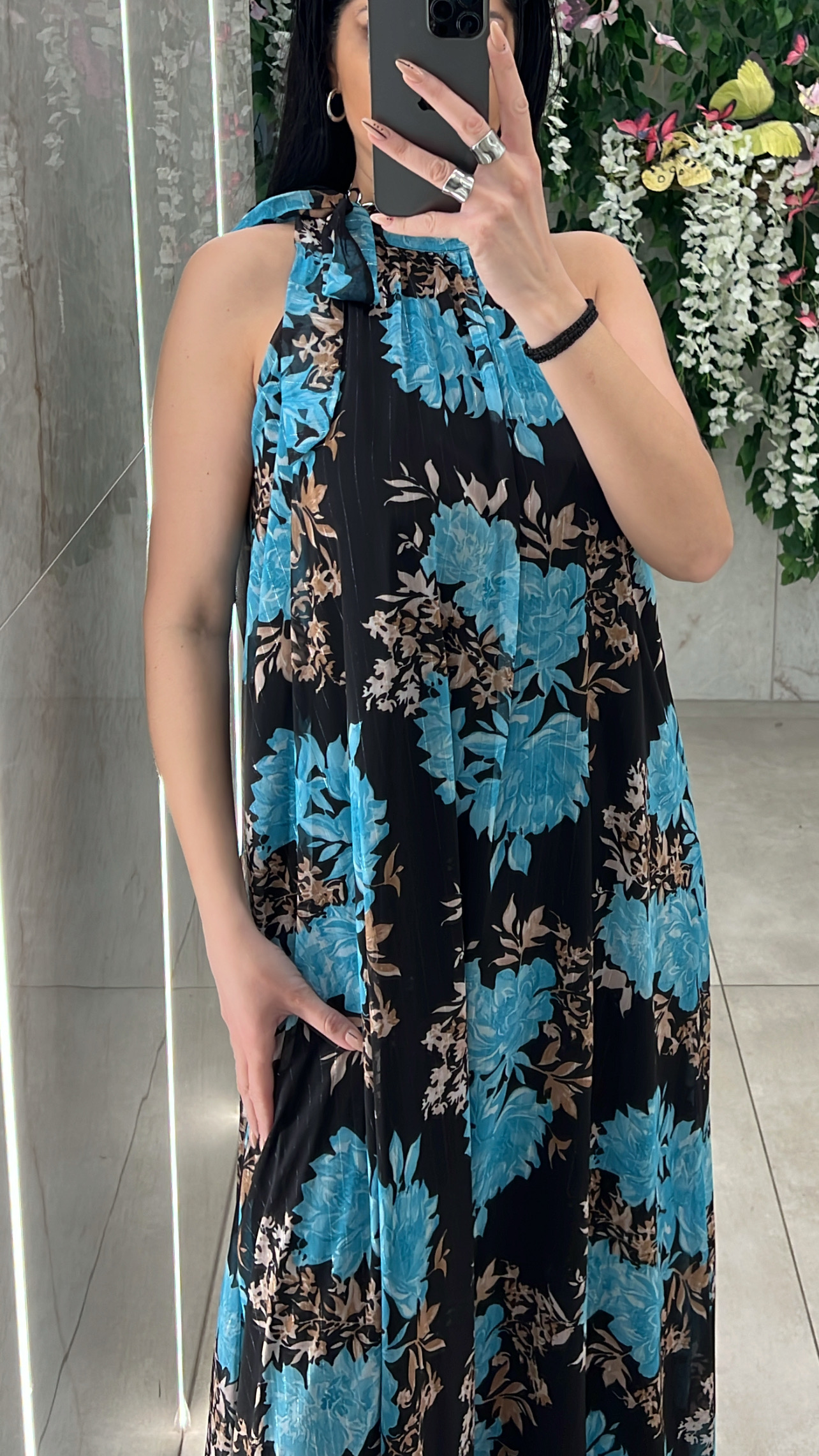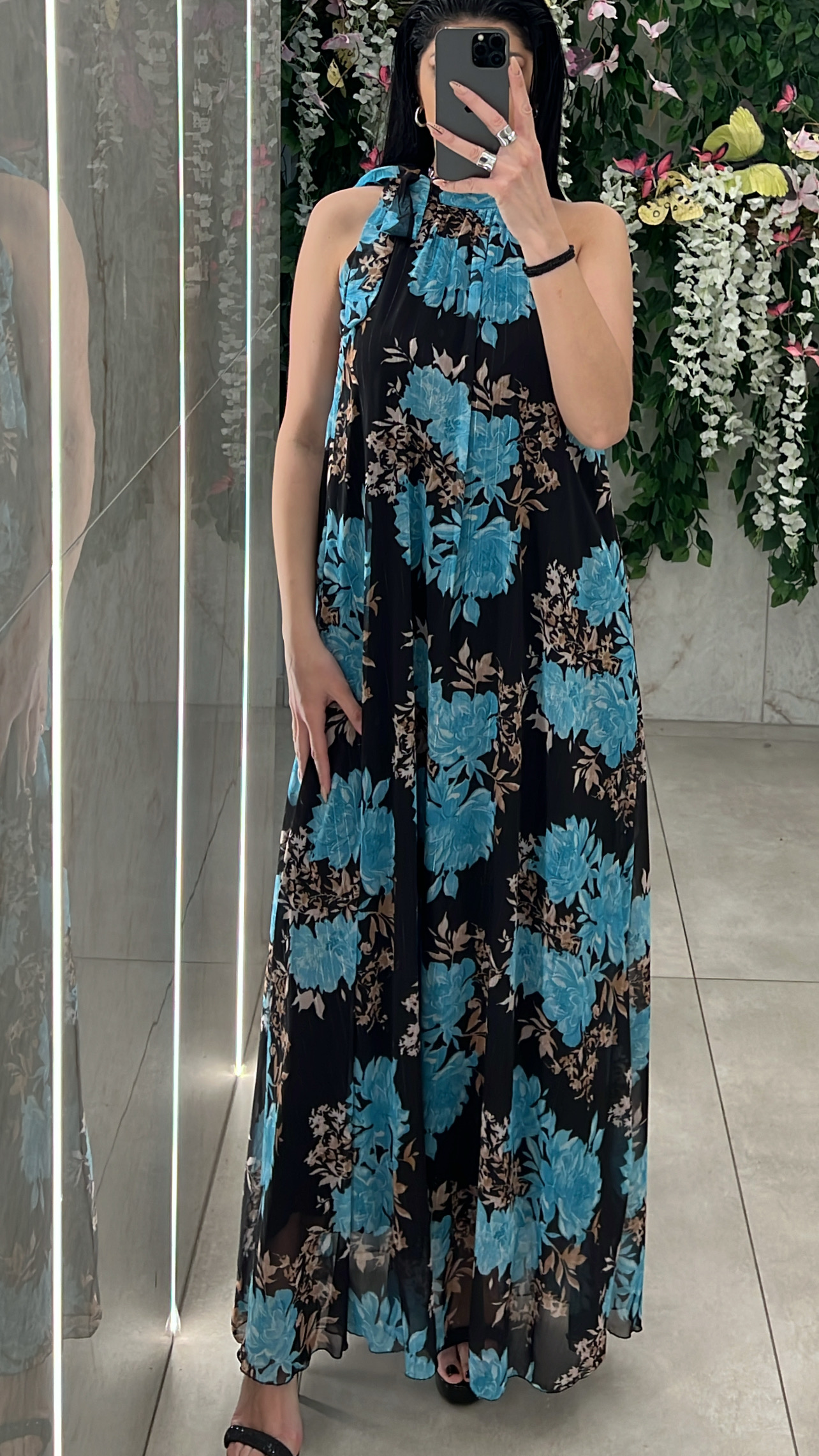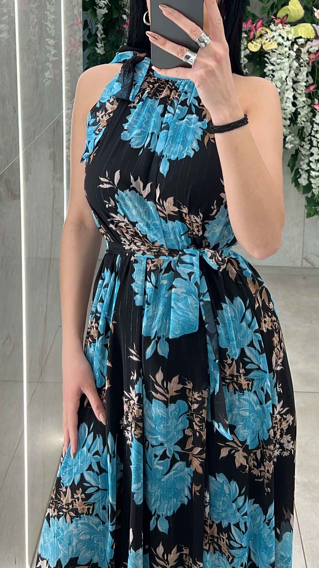 Φόρεμα φλοράλ , διαθέτει εσωτερική φόδρα , δική της ζώνη και δένει στον λαιμο .