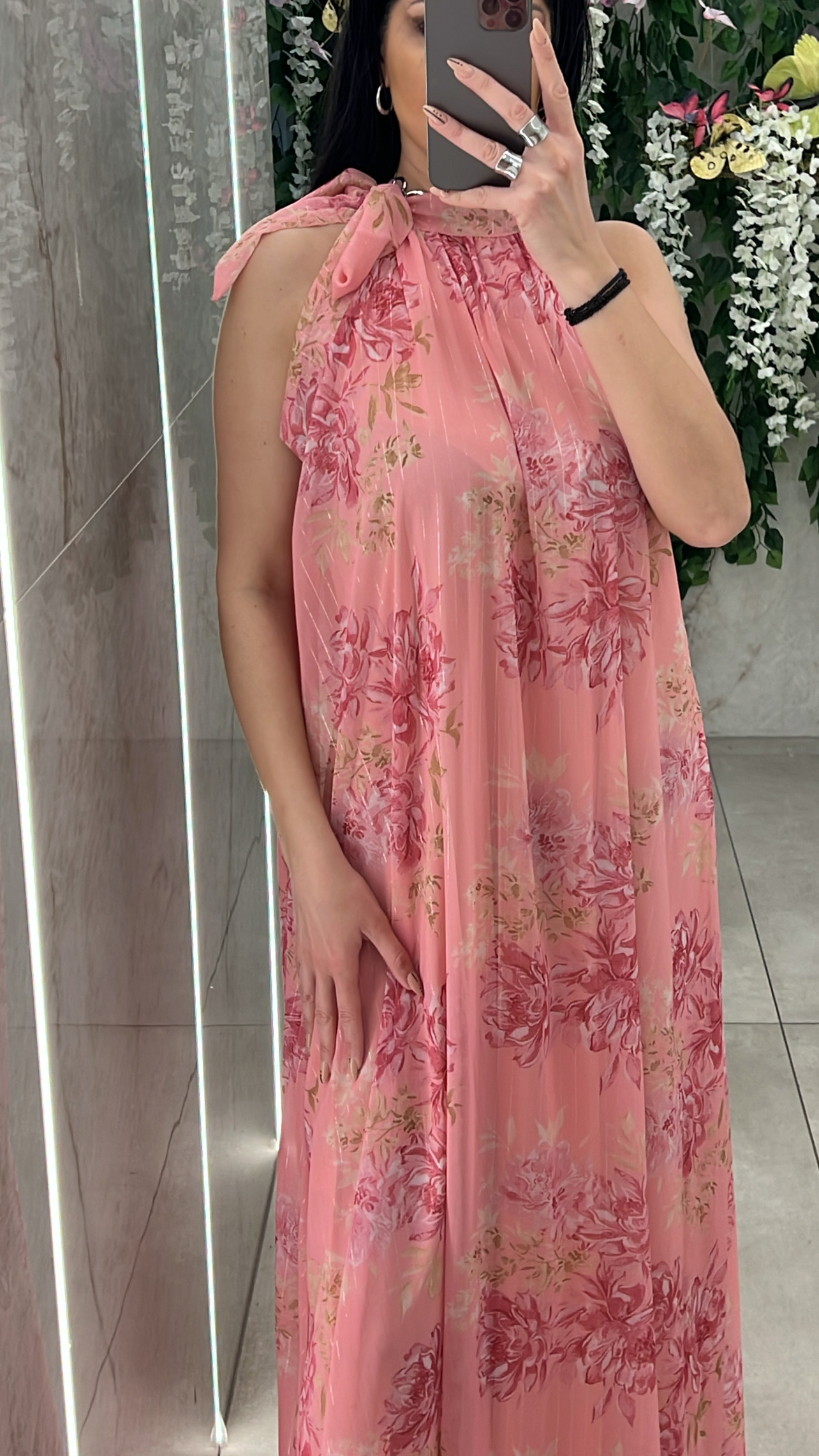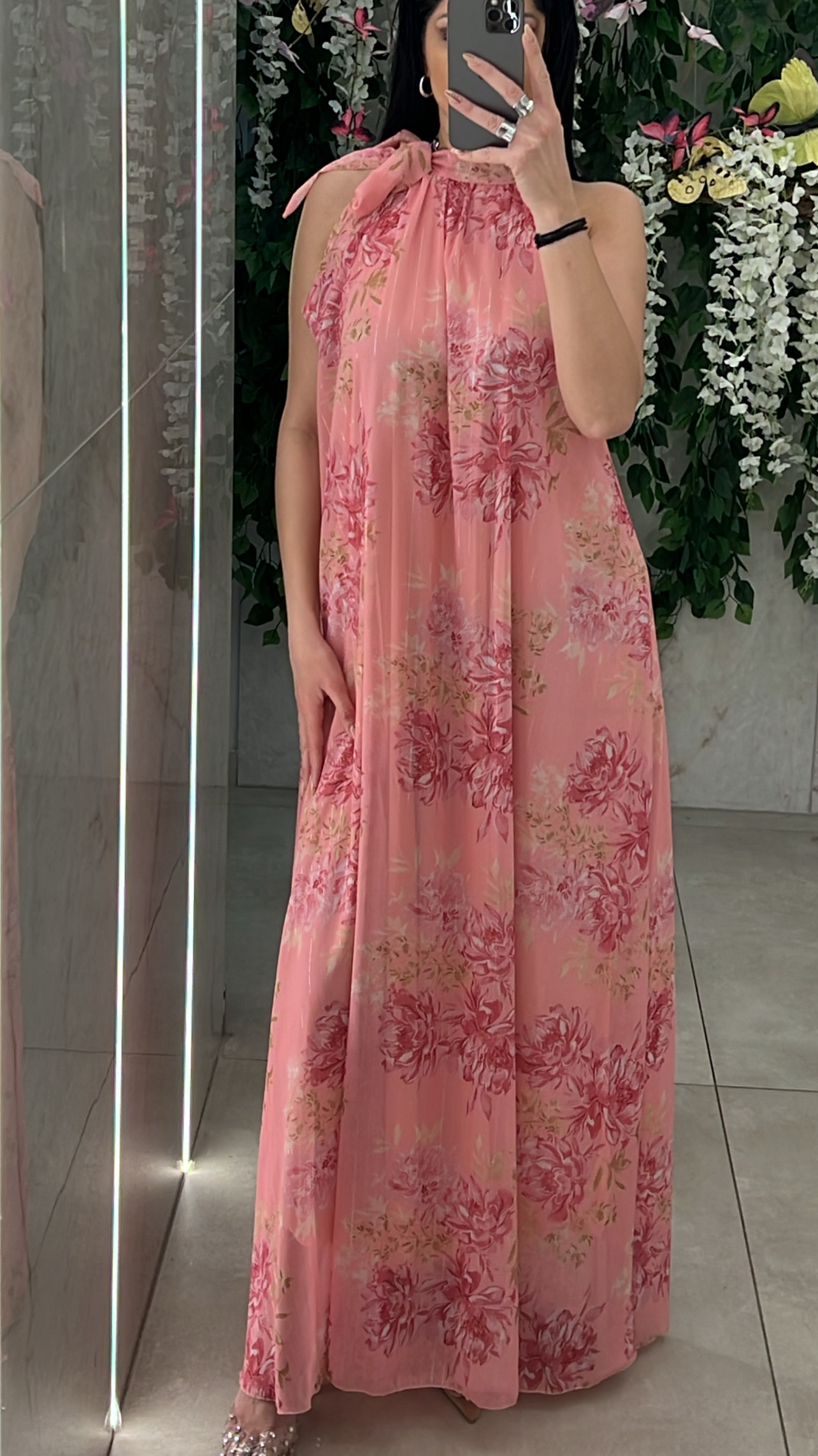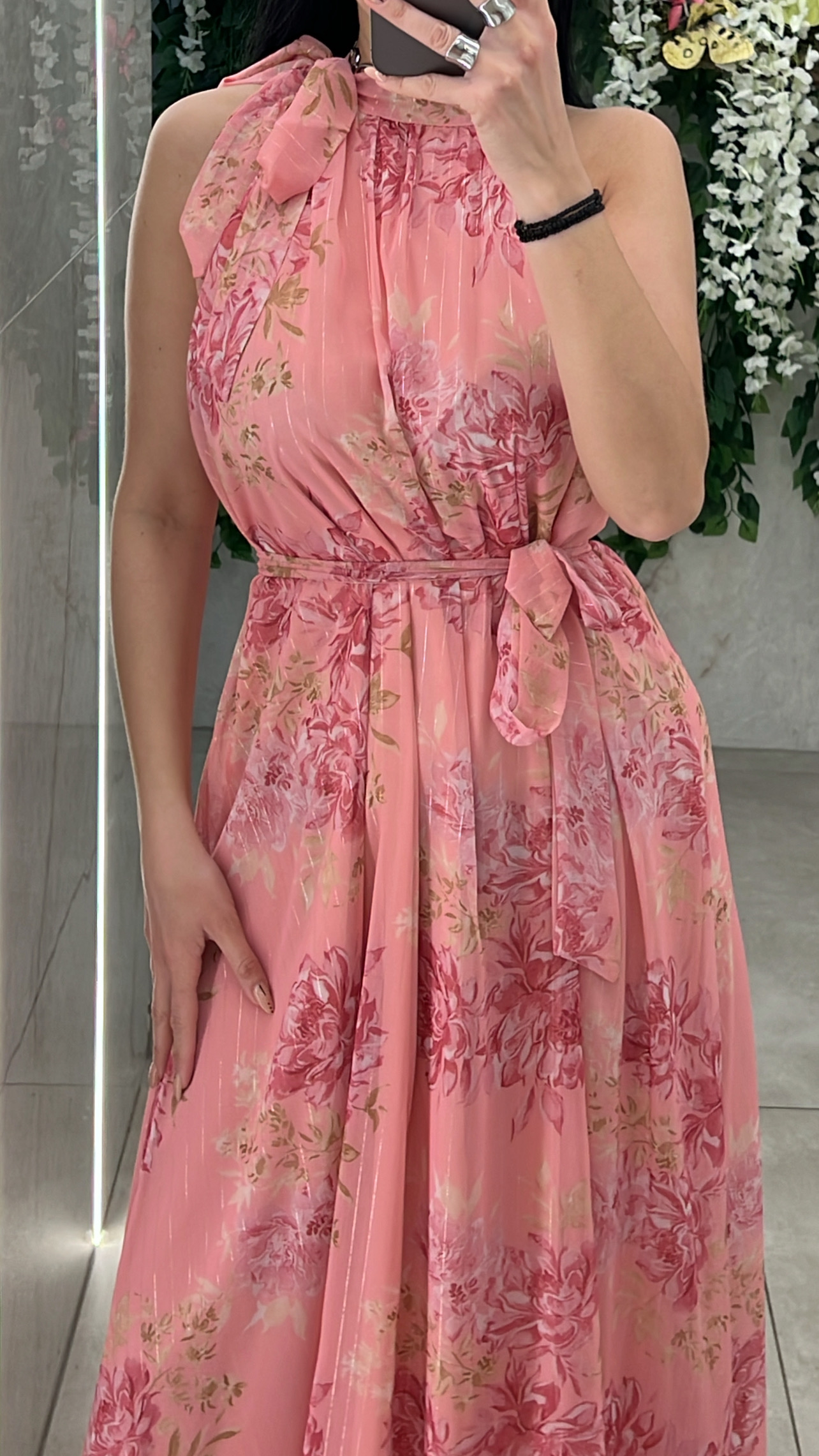 Φόρεμα φλοράλ , διαθέτει εσωτερική φόδρα , δική της ζώνη και δένει στον λαιμο .
